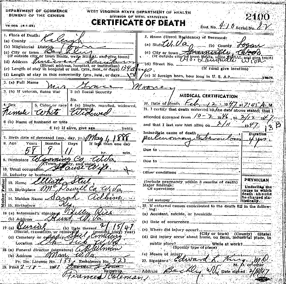 Buried: February 15, 1947 in Speel Cemetery, Elk Lick, Wyoming County, West Virginia. (Death Certificate.)