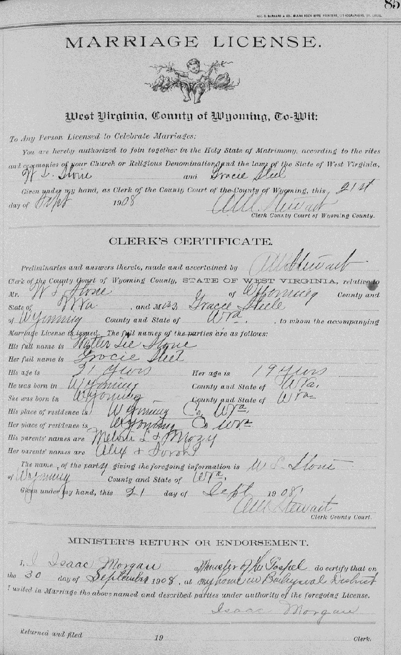 Married: (1) Walter Lee Stone September 30, 1908 in Baileysvale District, Wyoming County, West Virginia. (He was born March 22, 1887, Wyoming County, West Virginia; died January 26, 1926, Crown, Logan County, West Virginia.)