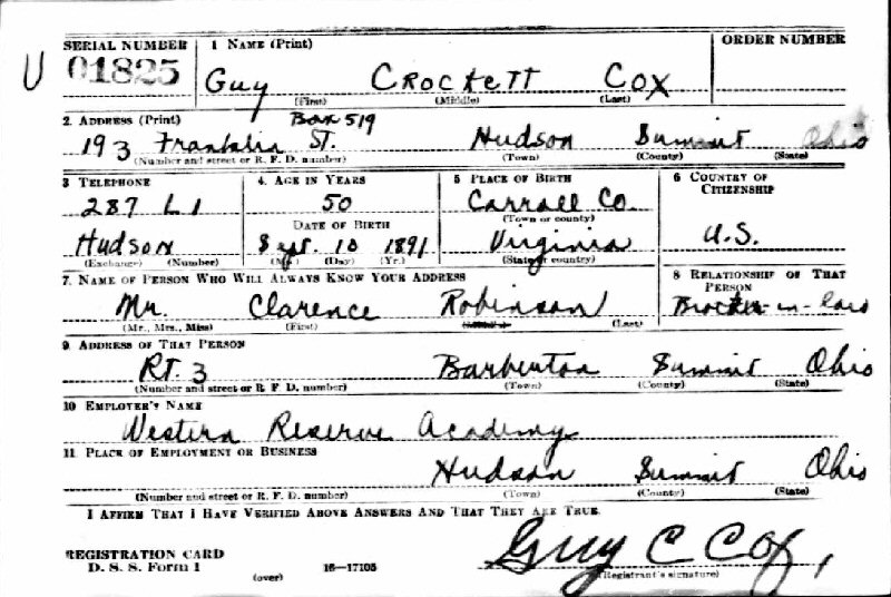 Son of John Stanford and Laura Moline (Bedsaul) Cox.
