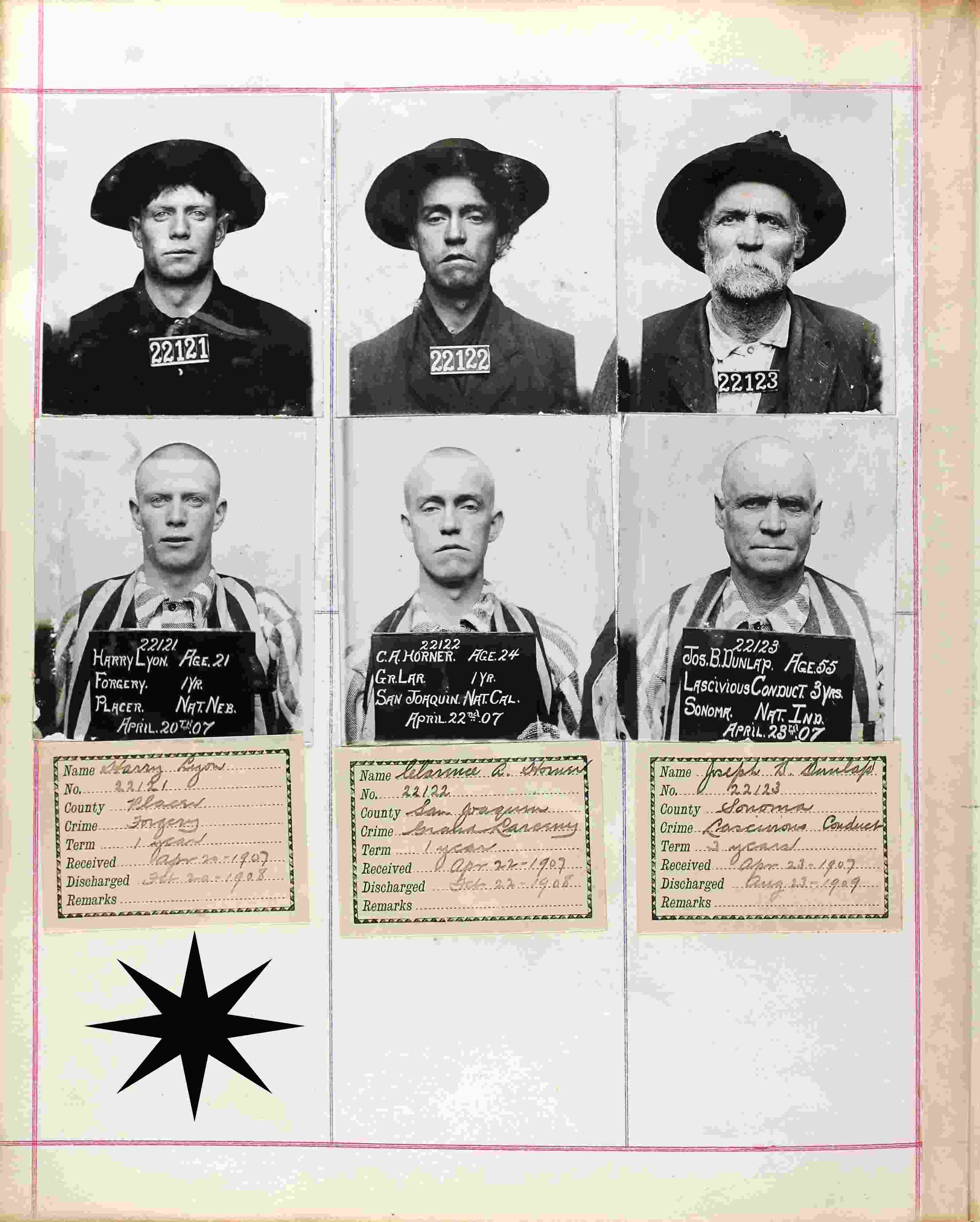 April 20, 1907 - San Quentin Prison, San Quentin, Marin County, California. (Released: Febuary 20, 1908. Place of Crime/Crime: Placer County, California; Forgery.)