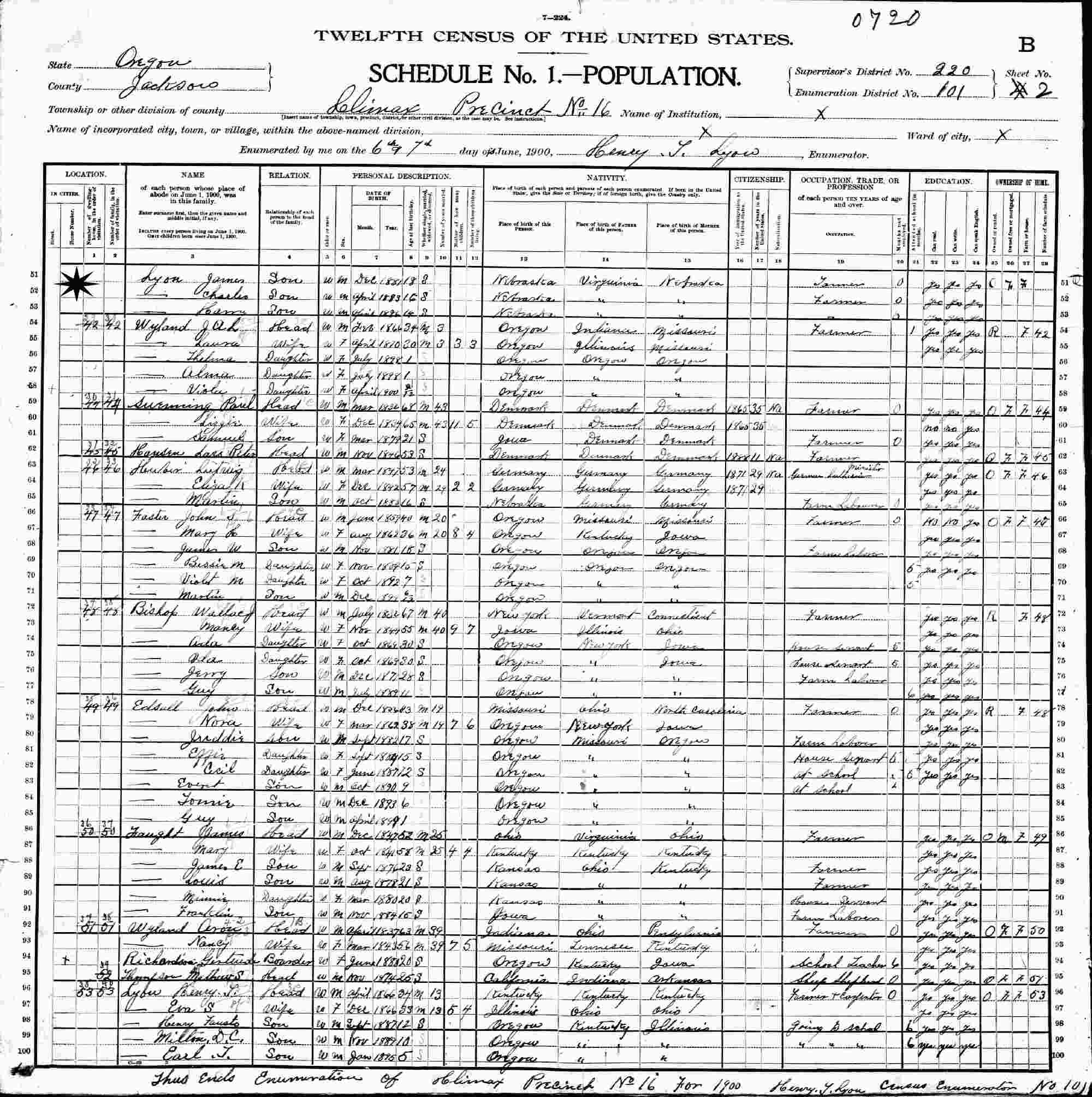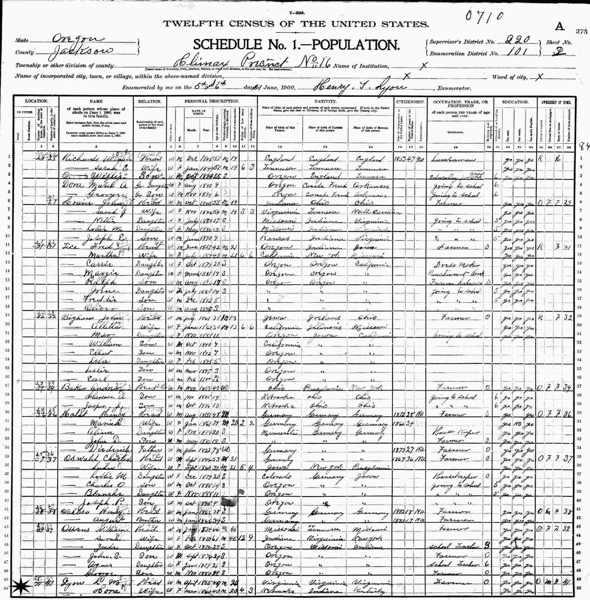 June 6-7, 1900 - Precinct 16, Supervisor's District 220, Enumeration District 101, Climax, Jackson County, Oregon.