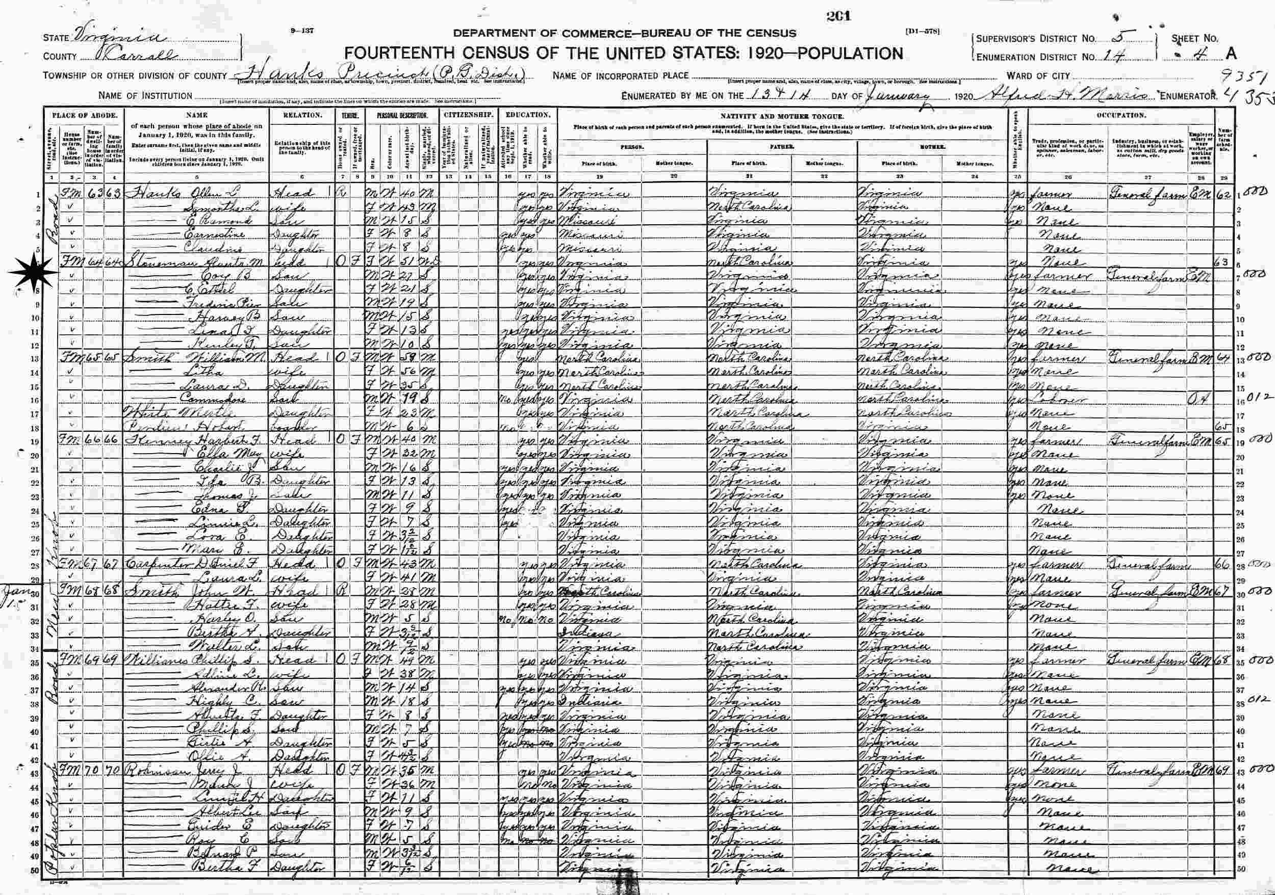 January 13-14, 1920 - New Knob Road, Supervisor's District 5, Enumeration District 14, Hanks, Pipers Gap District, Carroll County, Virginia.