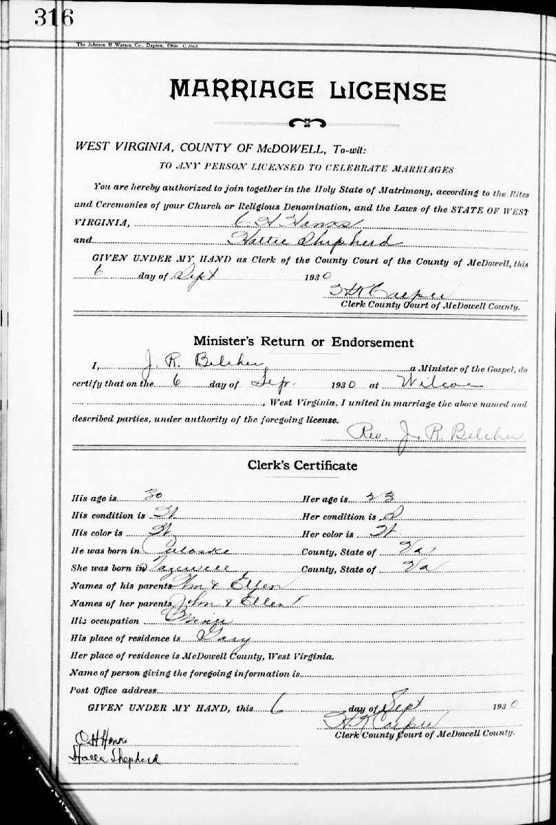 Married: Henry Clay Hanks September 6, 1930 in Wilcoe, McDowell County, West Virginia.