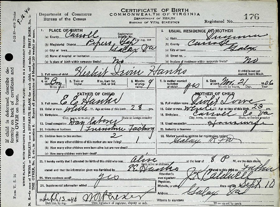 Born: November 21, 1906 in Pipers Gap, Carroll County, Virginia.