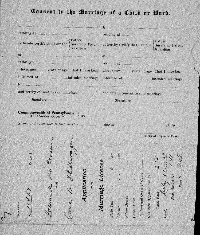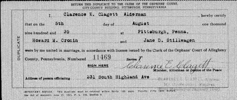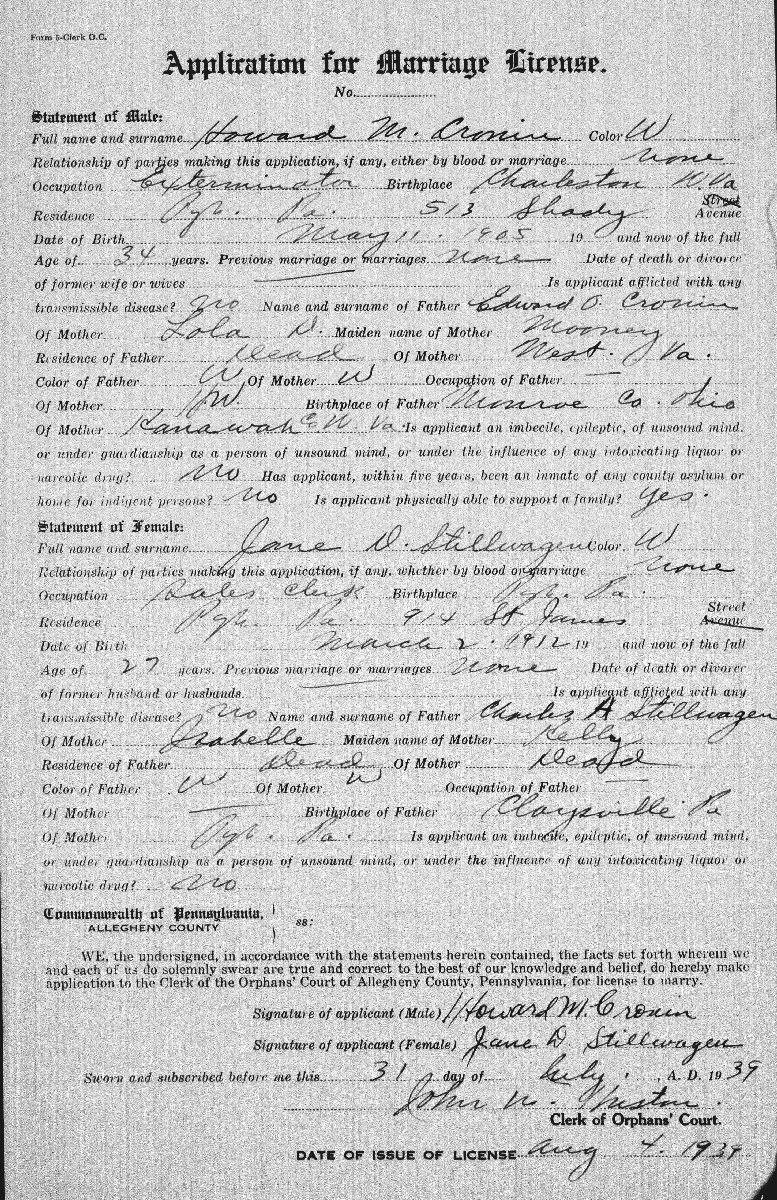 Married: Jane D Stillwagen August 05, 1939 in Allegheny County, Pennsylvania. (Marriage License Application: July 31, 1939.)