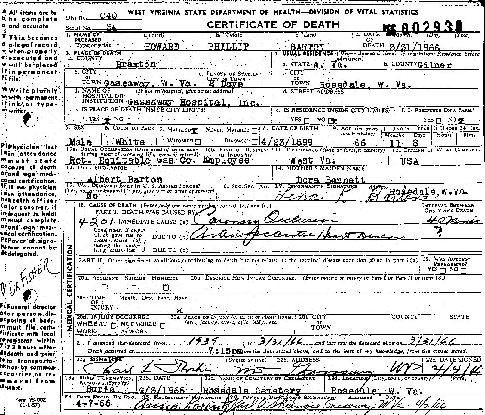 Died: March 31, 1966 in Gassaway Hospital, Braxton, Gilmer County, West Virginia.