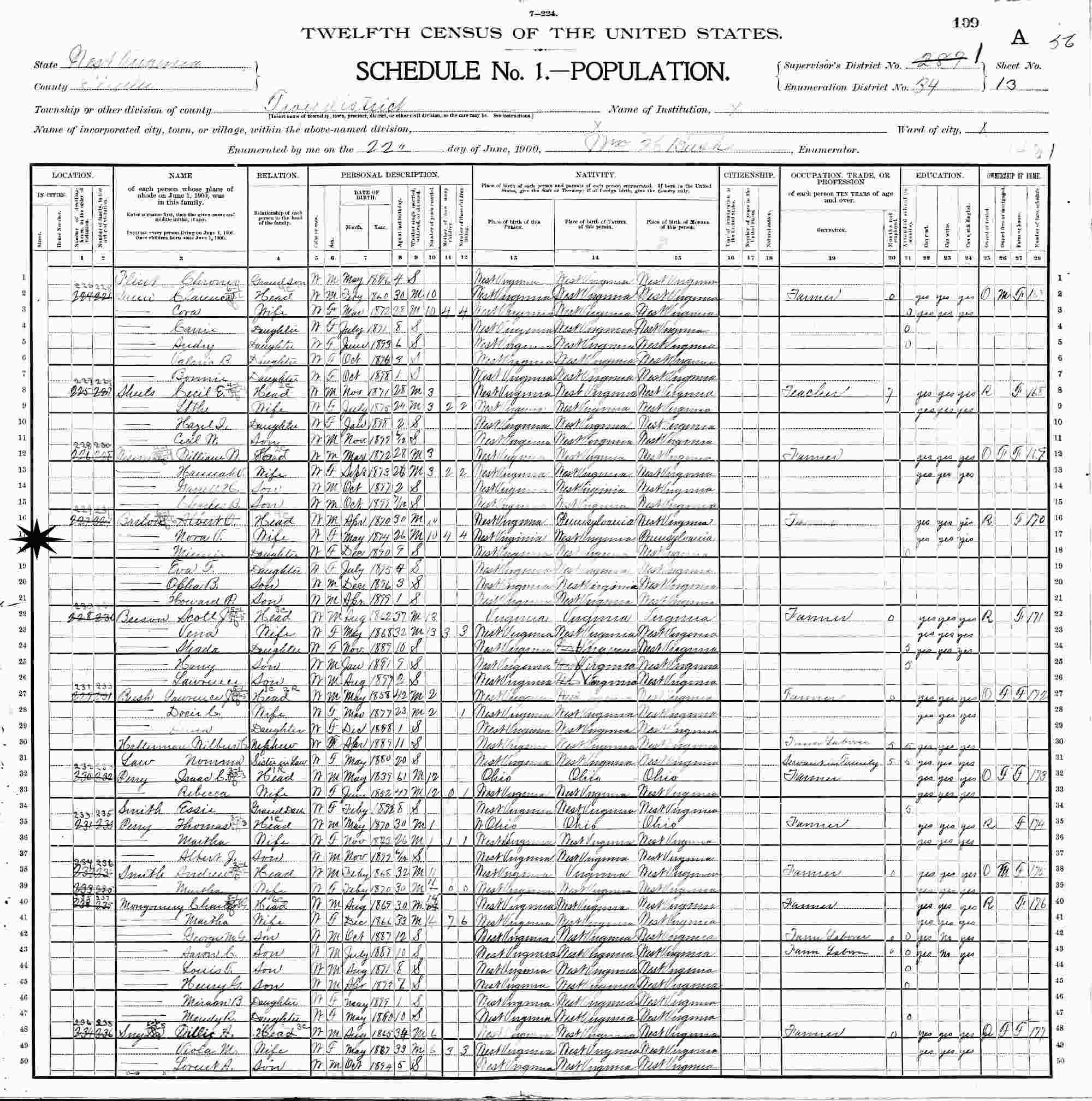 June 22, 1900 - Supervisor's District 287 (crossed out to 1), Enumeration District 34, Troy District, Gilmer County, West Virginia.
