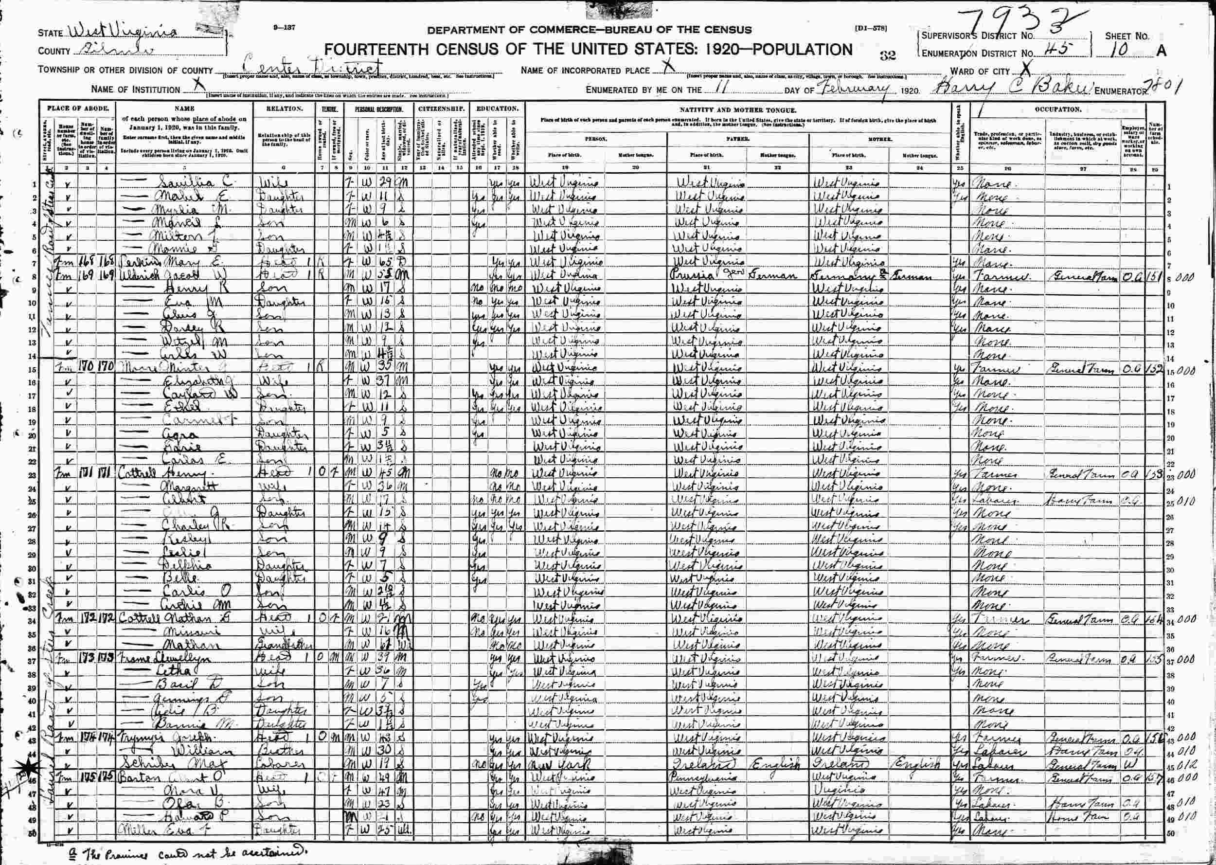 Frebuary 11, 1920 - Supervisor's District 3, Enumeration District 45, Center District, Gilmer County, West Virginia.