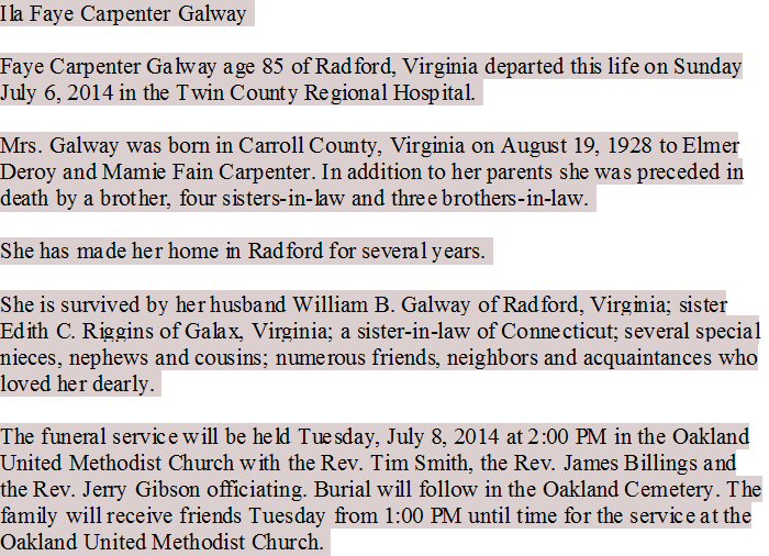 Buried: July 8, 2014 in Oakland United Methodist Church Cemetery, Carroll County, Virginia.