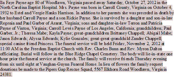 Buried: November 2, 2012 in Blue Ridge Baptist Chapel Cemetery, Carroll County Virginia.