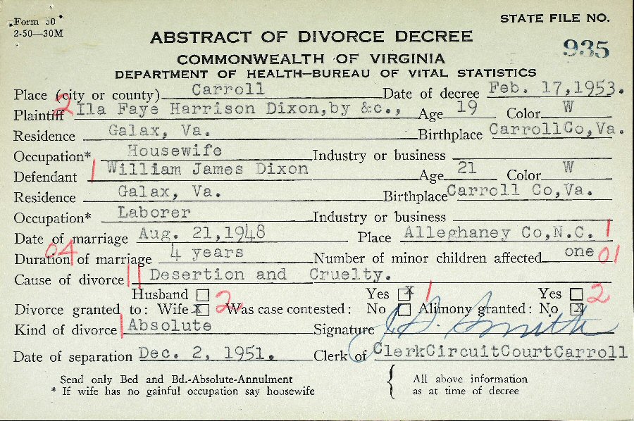Married: (1) William James Dixon August 21, 1948 in Alleghaney County, North Carolina.
