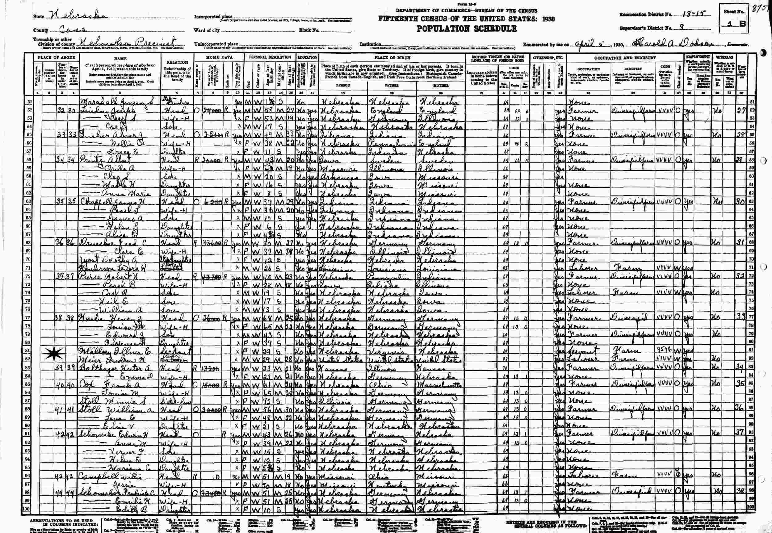 April 5, 1930 - Supervisor's District 8, Enumeration District 13-15, Nehawka Precinct, Cass County, Nebraska.