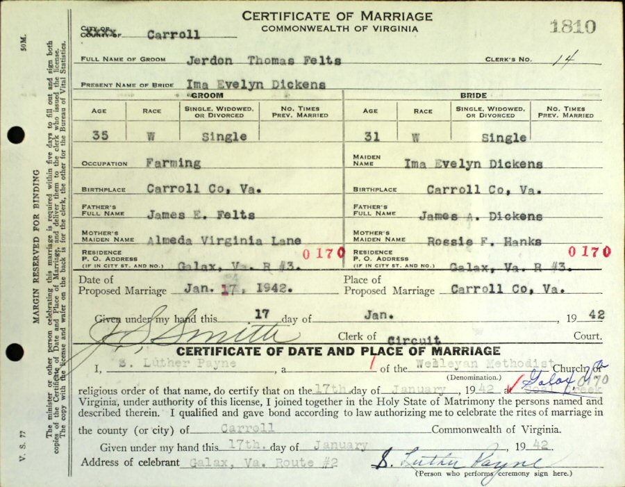 Married: Jerdon Thomas Felts January 17, 1942 in Galax, Virginia.