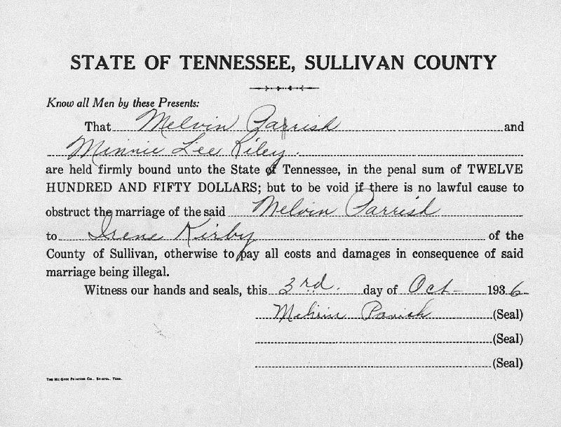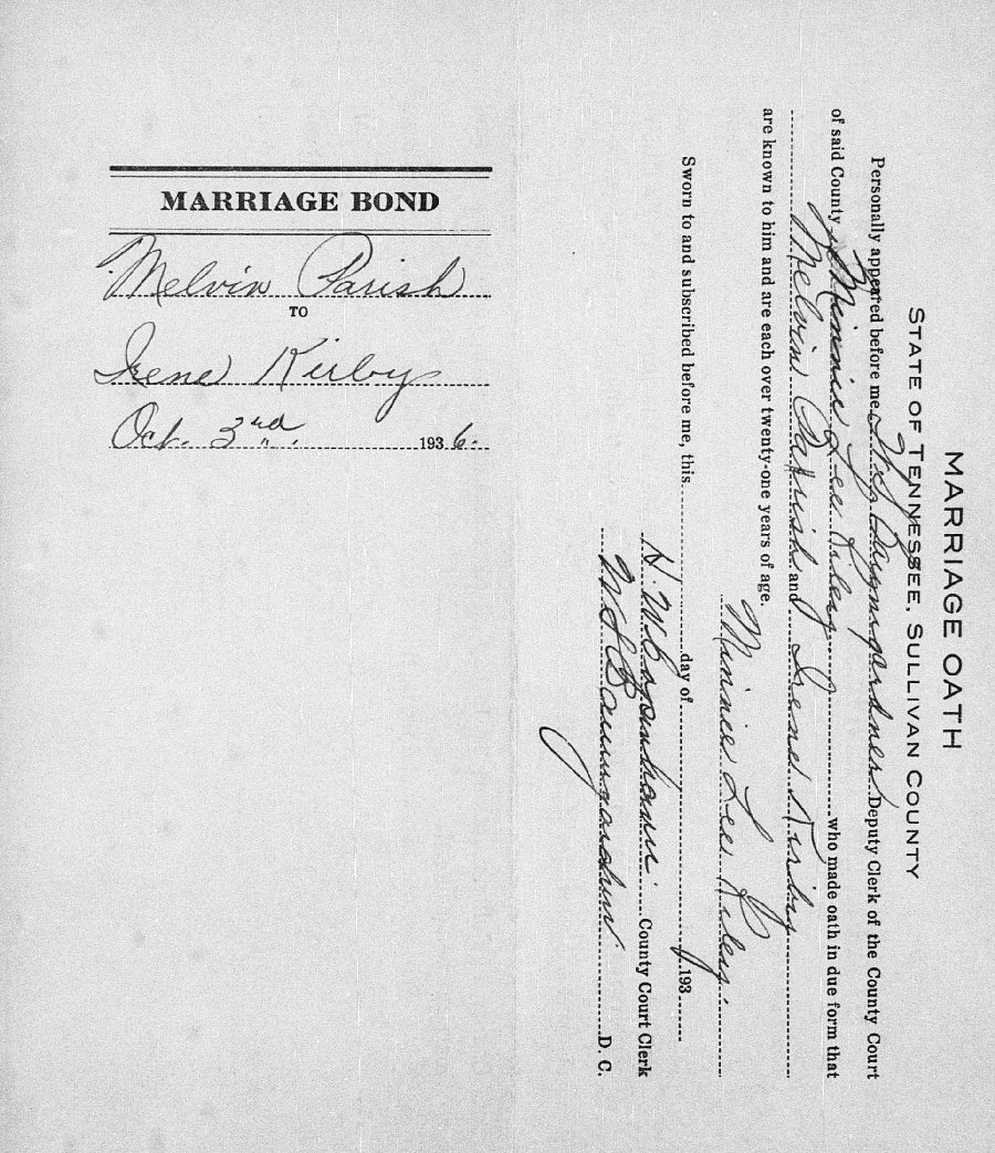 Married: Melvin Gray Parrish October 3, 1936 in Sullivan County, Tennessee.