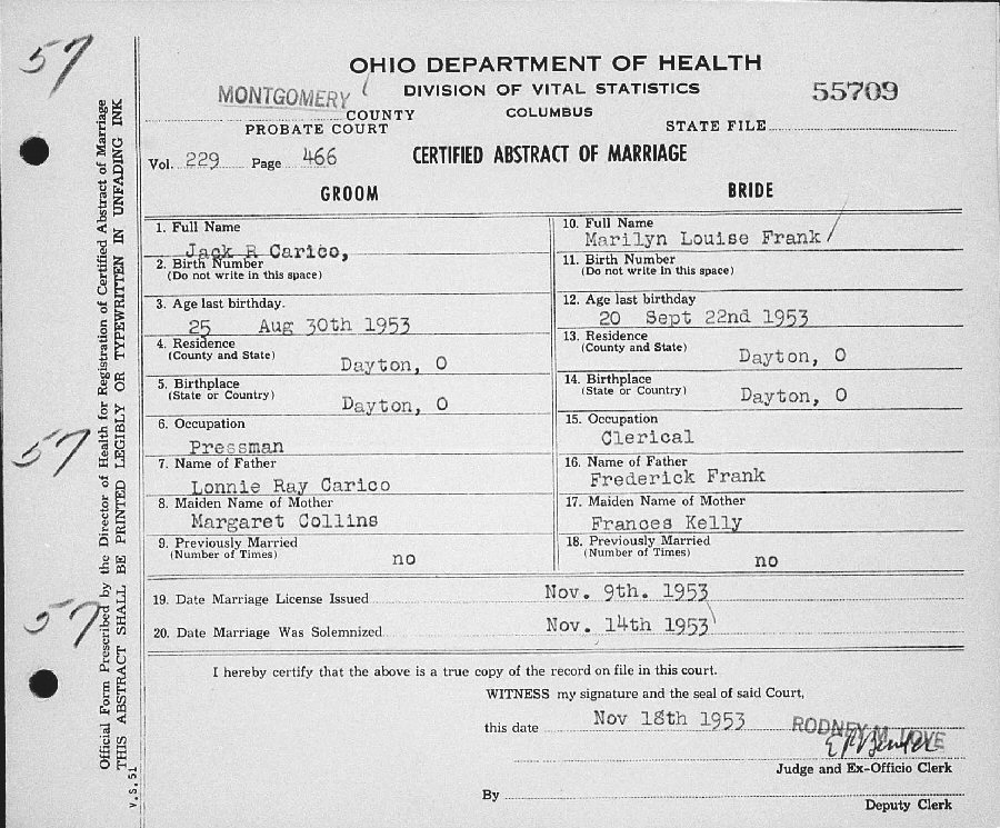 Married: Marilyn Louise Frank November 18, 1953 in Montgomery County, Ohio (probably Dayton).