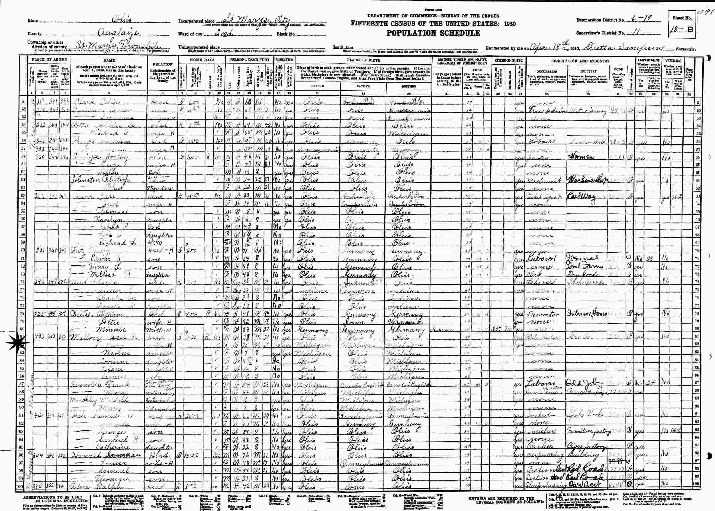 April 18, 1930 - 402 W. Madison, Ward 2, Supervisor's District 11, enumeration District 6-19, St. Marys Township, Auglaize County, Ohio.