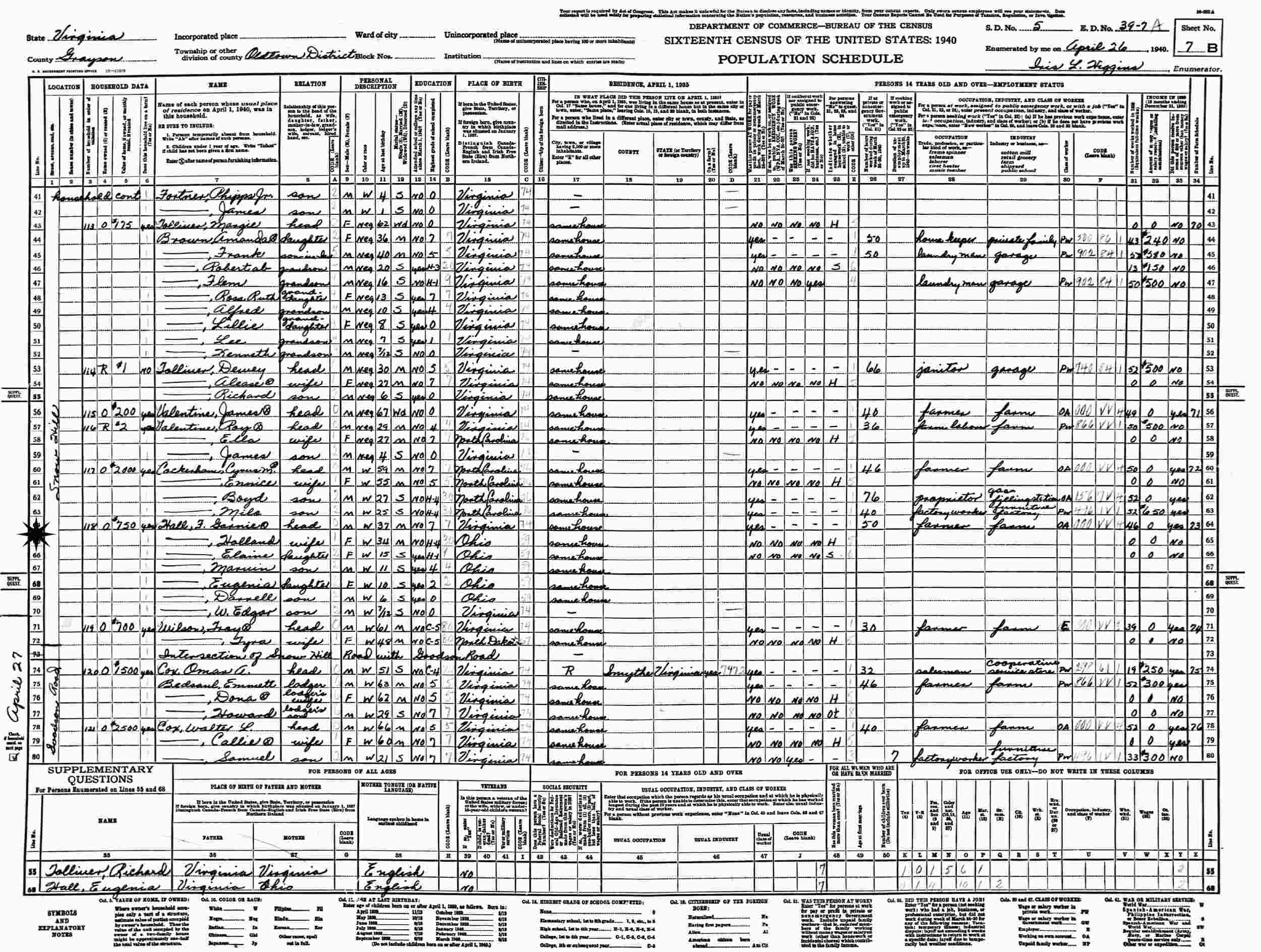 April 26, 1940 - Snow Hill, Supervisor's District 5, Enumeration District 39-7. Oldtown District, Grayson County, Virginia.