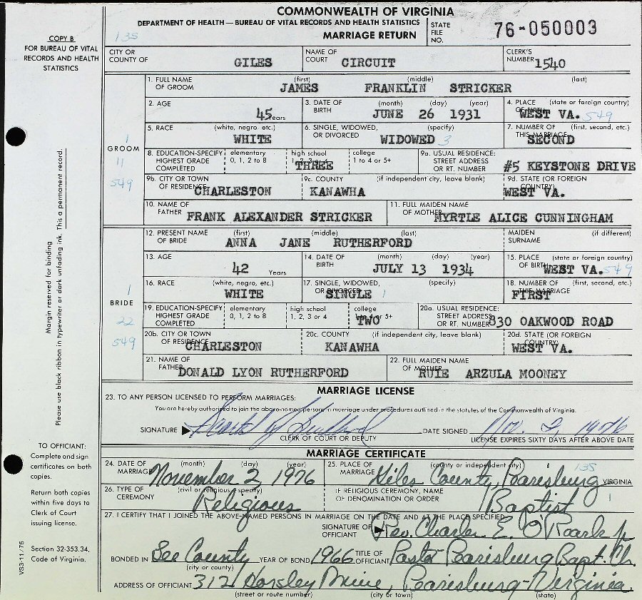 Married: Anna Jane Rutherford November 02, 1976 in Pearisburg, Giles County, Virginia.