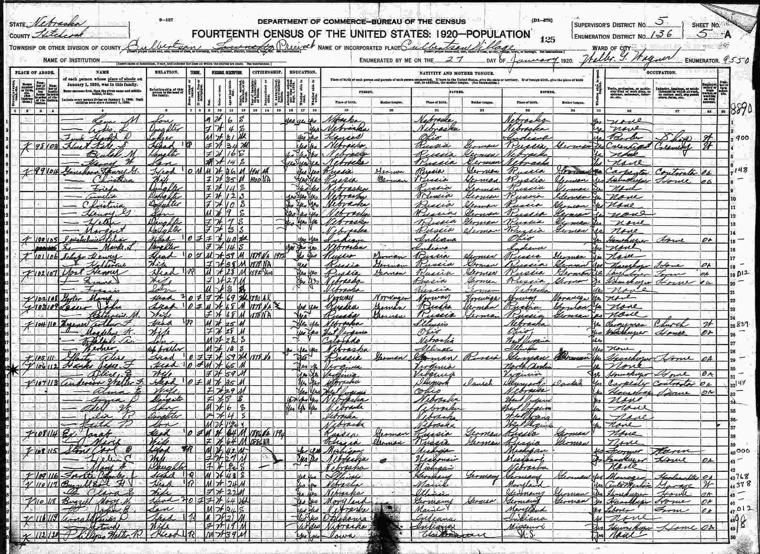 January 27, 1920 - Supervisor's District 5, Enumeration District 136, Culbertson, Hitchcock County, Nebraska.