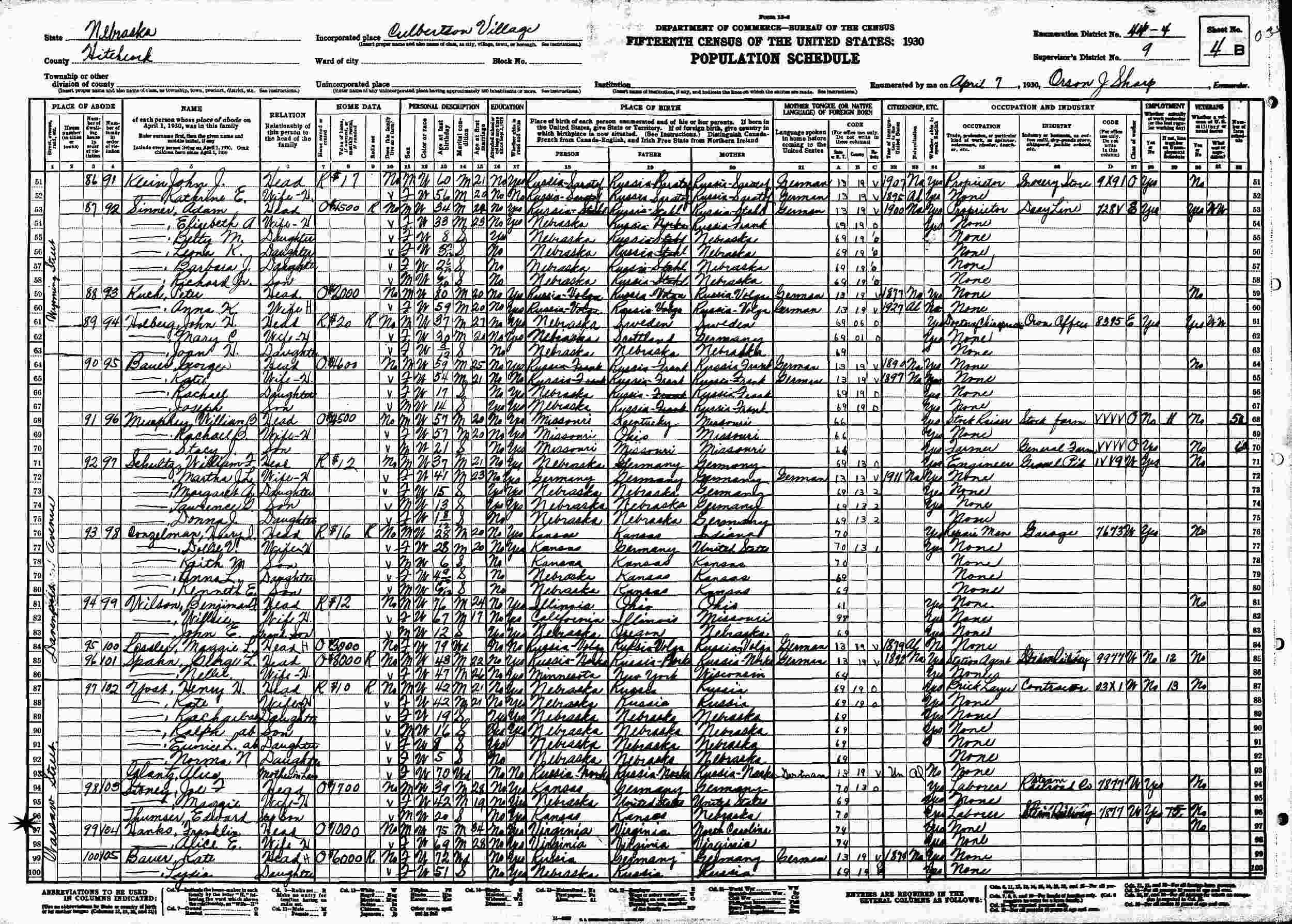 April 7, 1930 - Warsaw Street, Supervisor's District , Enumeration District 44-4, Culbertson, Hitchcock County, Nebraska.