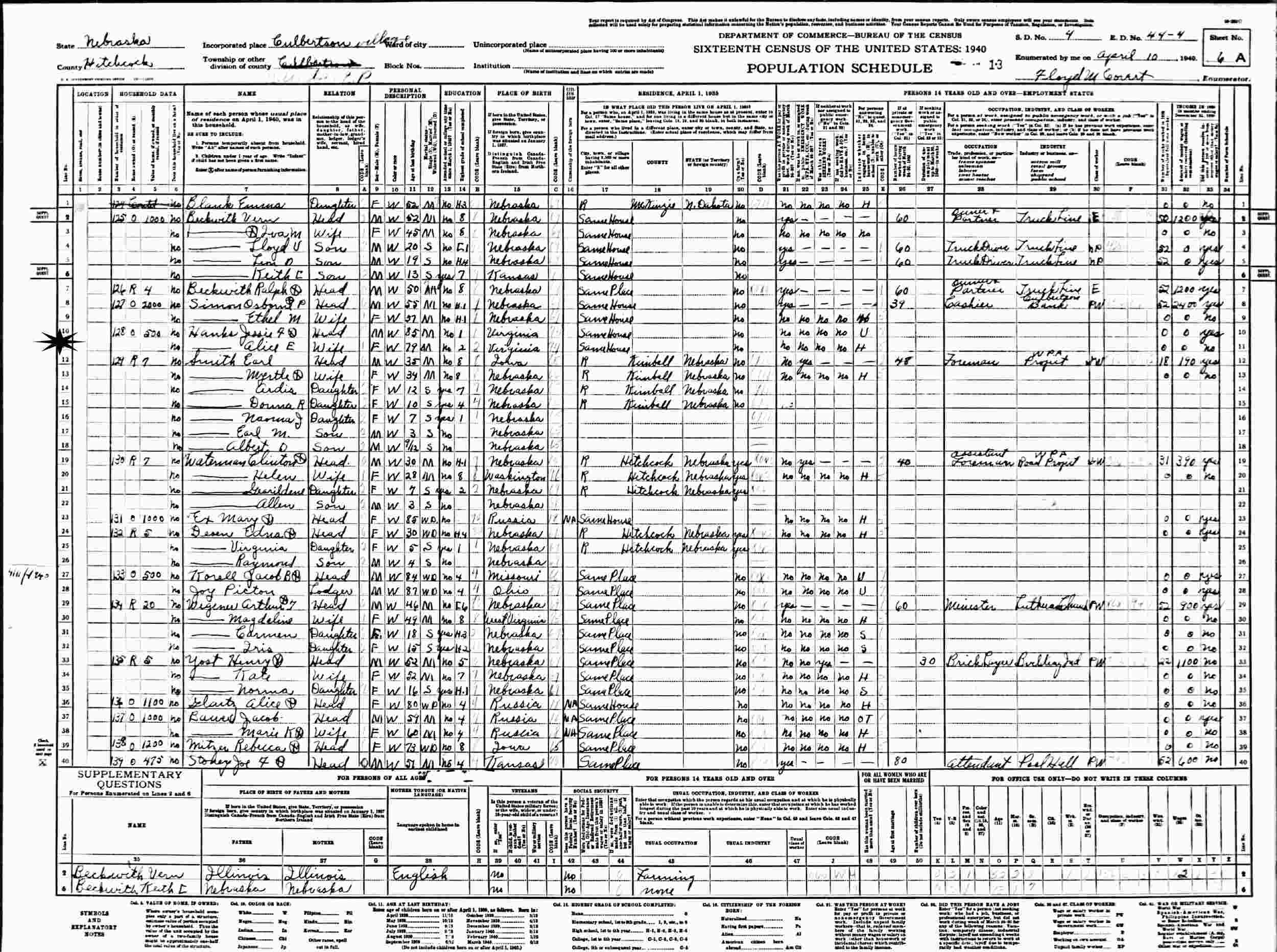 April 10, 1940 - Supervisor's District 4, Enumeration District 44-4, Culbertson, Hitchcock County, Nebraska.