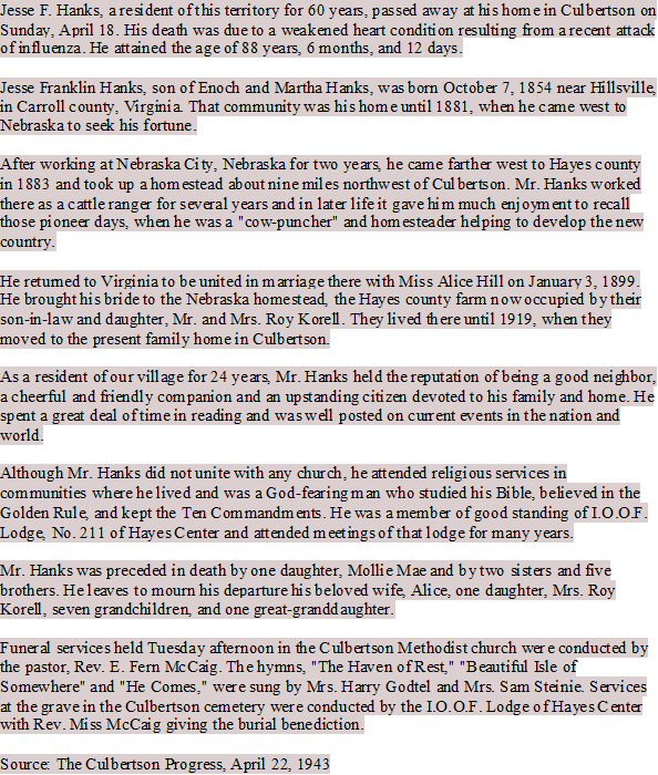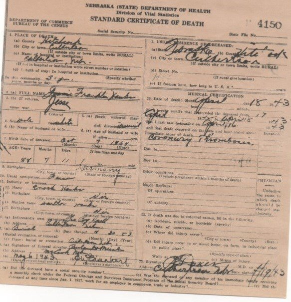 Died: April 18, 1943 in Culbertson, Hitchcock County, Nebraska.