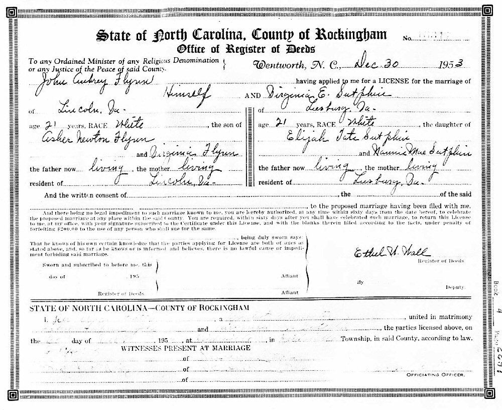 Married: Virginia Elizabeth Sutphin December 30, 1953 in Rockingham, Richmond County, North Carolina.