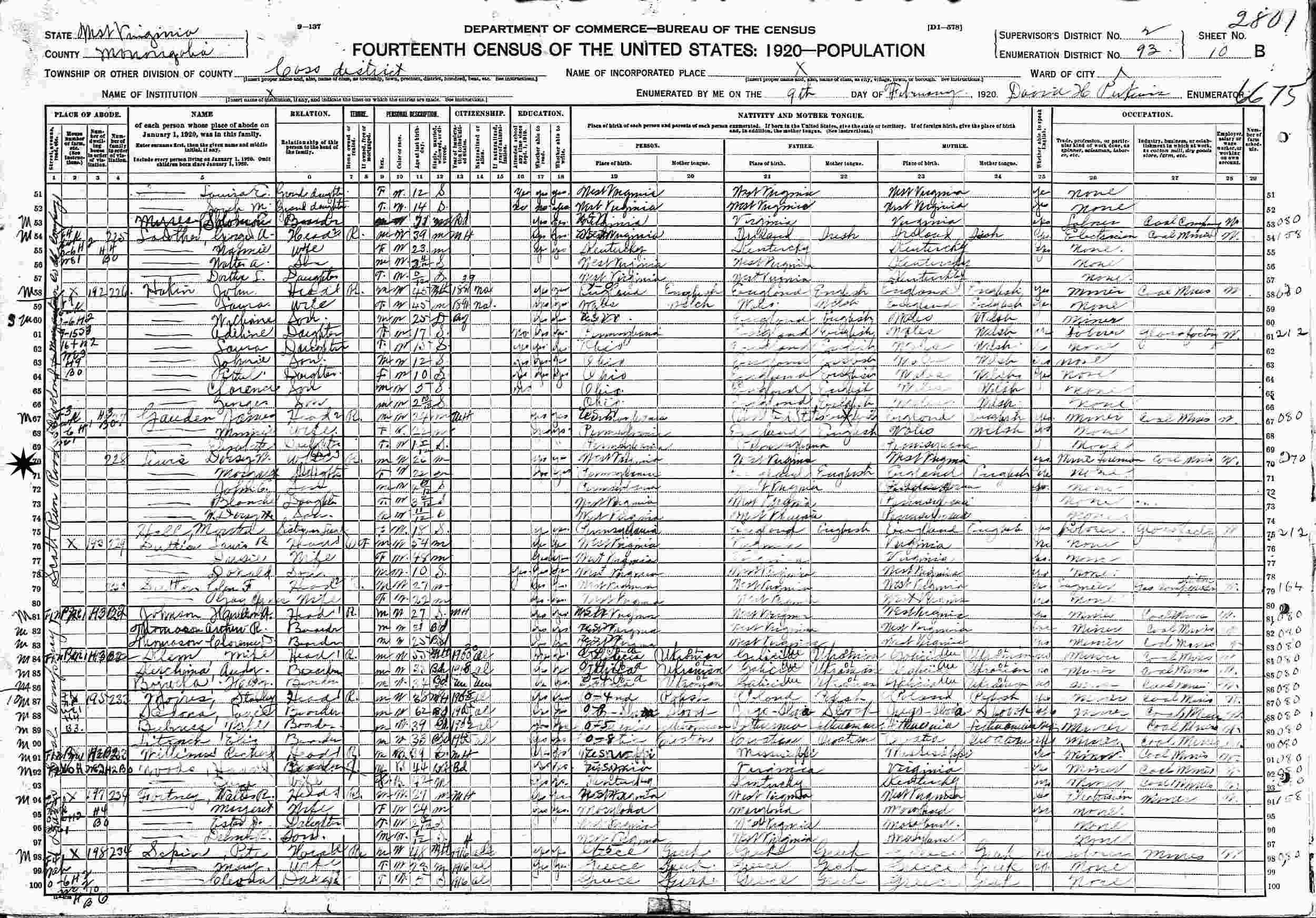 February 9, 1920 - Scott Run Road, Supervisor's District 2, Enumeration Distric 93, Cass District, Monongolia County, West Virginia.
