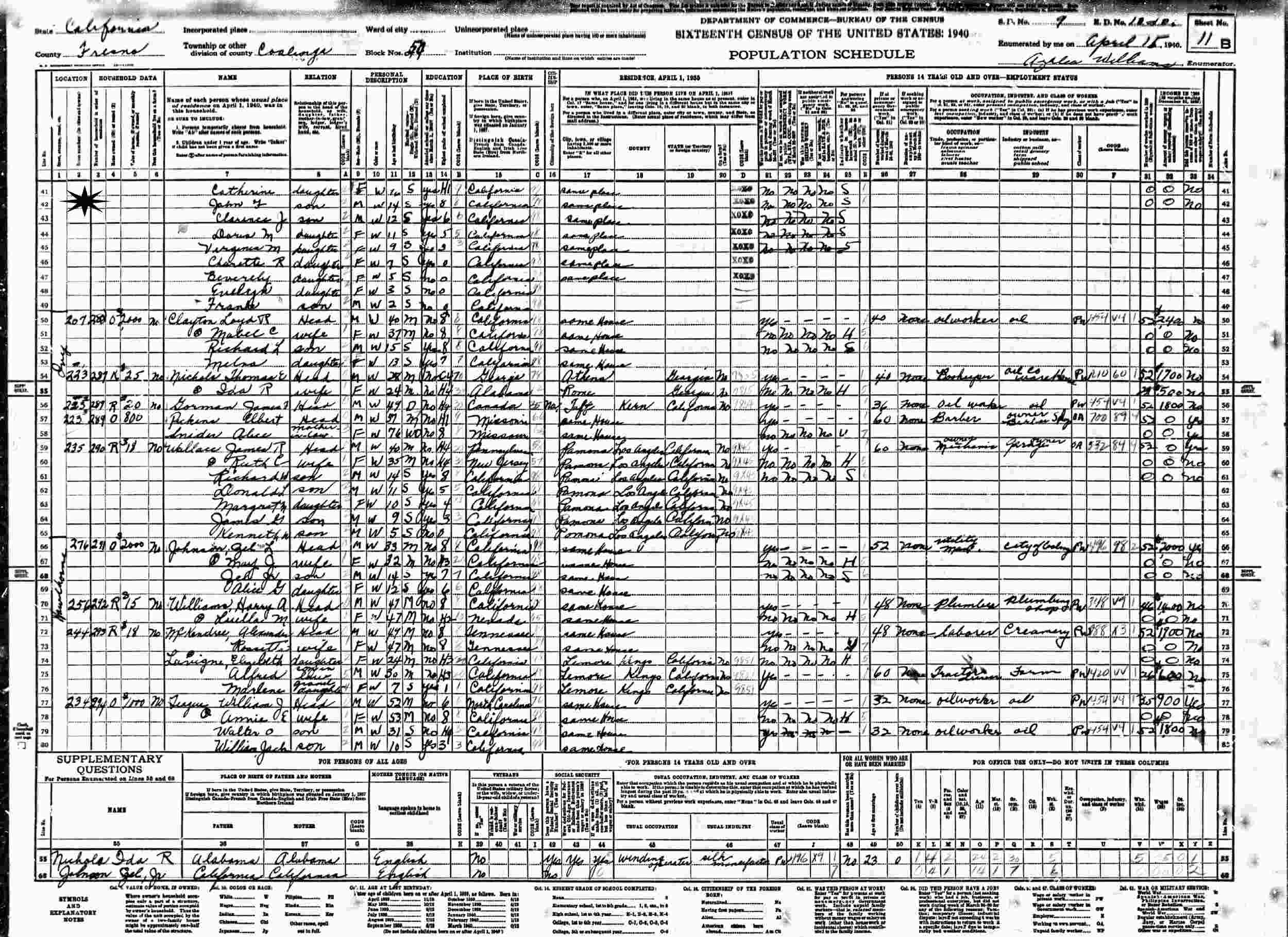 April 15, 1940 - 327 Fourth, Block 54, Supervisor's District 9, Enumeration District 10-??, Coalinga, Fresno County, California.