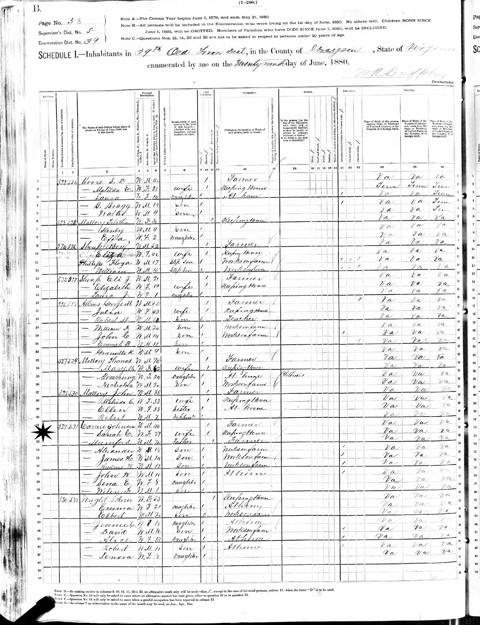 June 29, 1880 - 39th Old Town District, Supervisor's District 5, Enumeration District 39, Grayson County, Virginia.