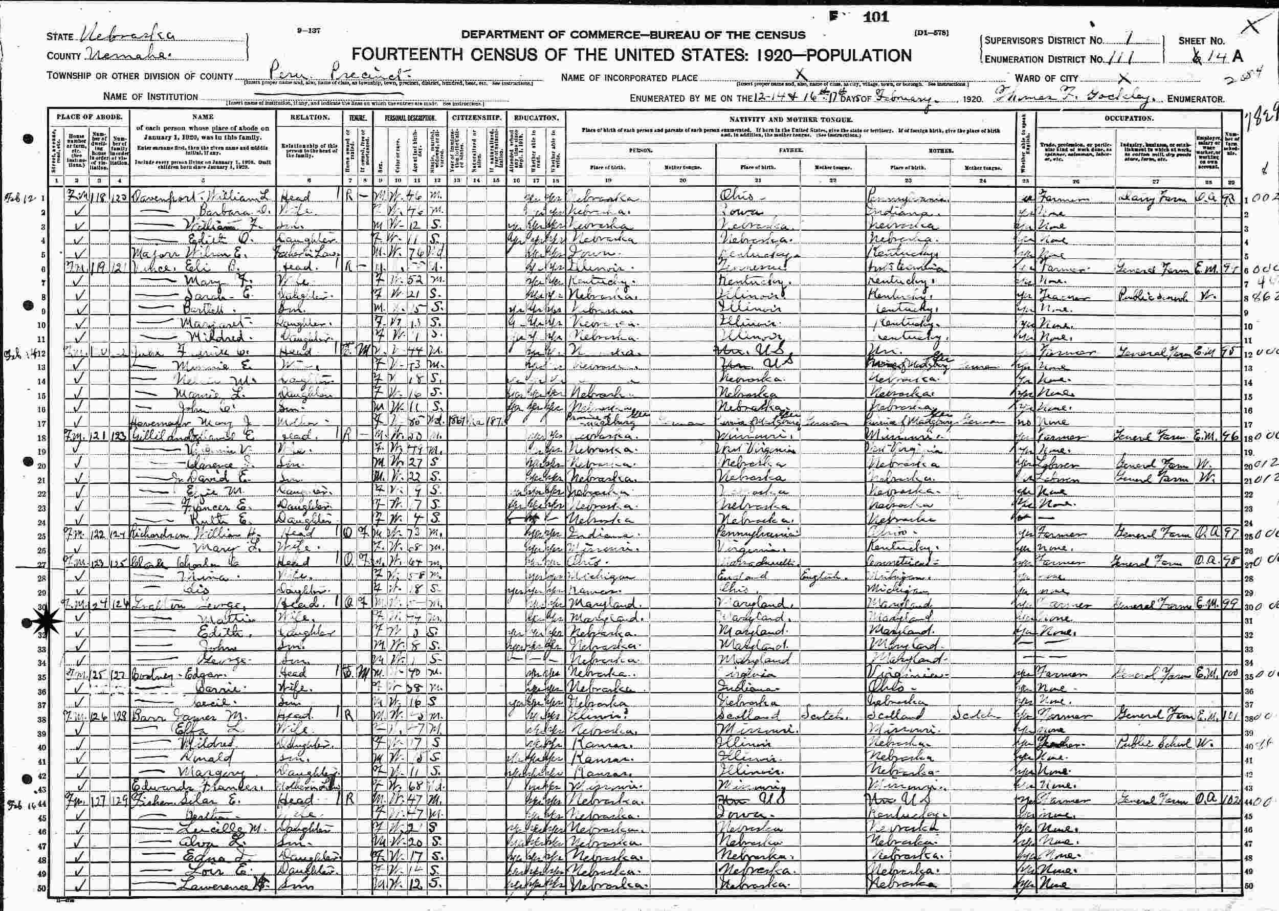 February 12-17, 1920 - Supervisor's District 1, Enumeration District 111, Peru Precinct, Nemaha County, Nebraska.