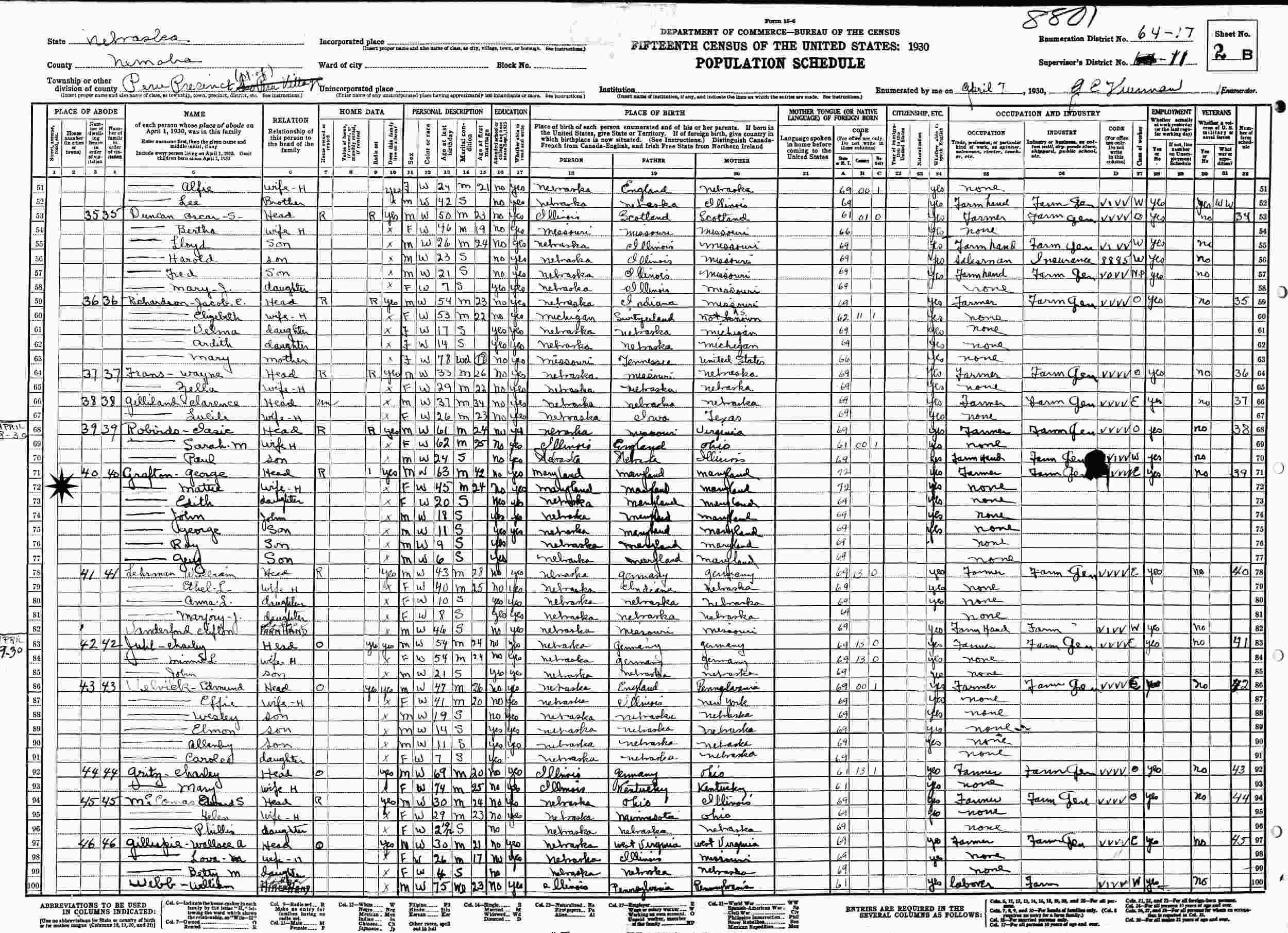 April 28-30, 1930 - Supervisor's District 11, Enumeration District 64-17, Peru Precinct, Nemaha County, Nebraska.