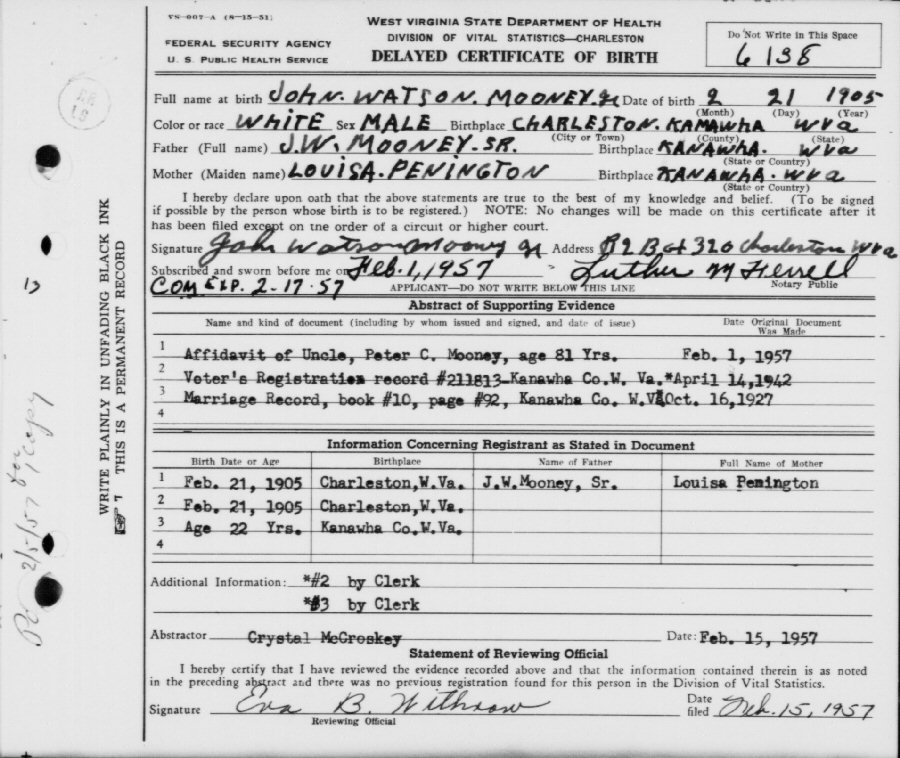 Notes for JOHN WATSON MOONEY, JR.: