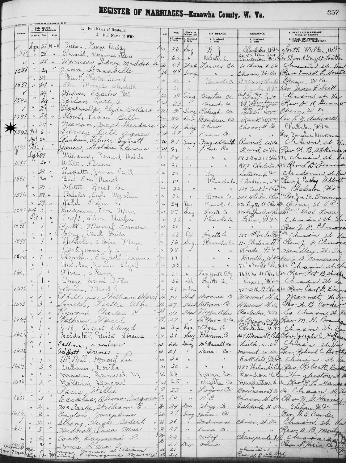 Married: Ruth Agnes Tierney October 06, 1945 in Kanawha County, West Virginia.