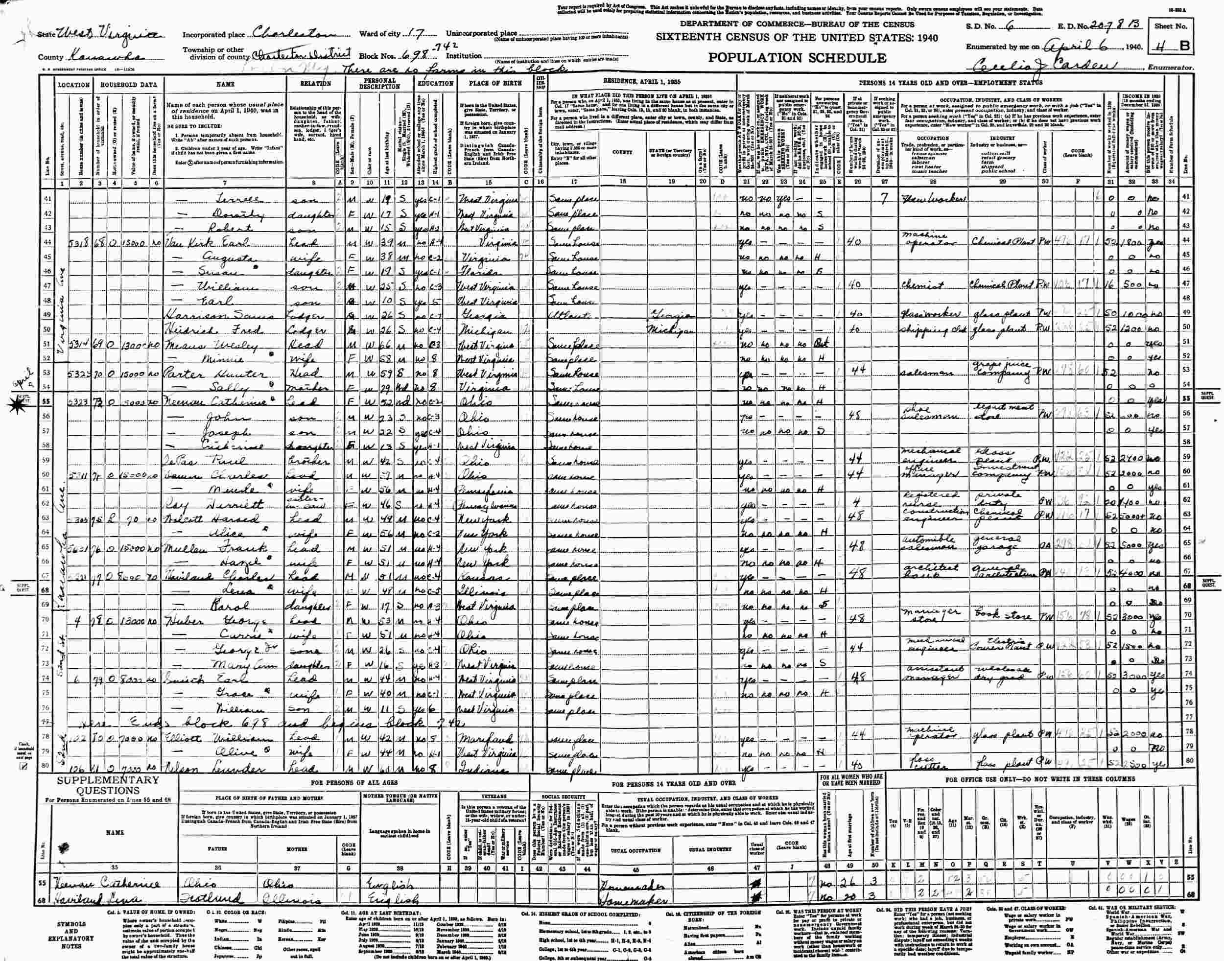 April 6, 1940 - 5323 Kanawha Avenue, Ward 17, Blocks 698-742, Supervisor's District 6, Enumeration District 20-78B, Charleston, Kanawha County, West Virginia.