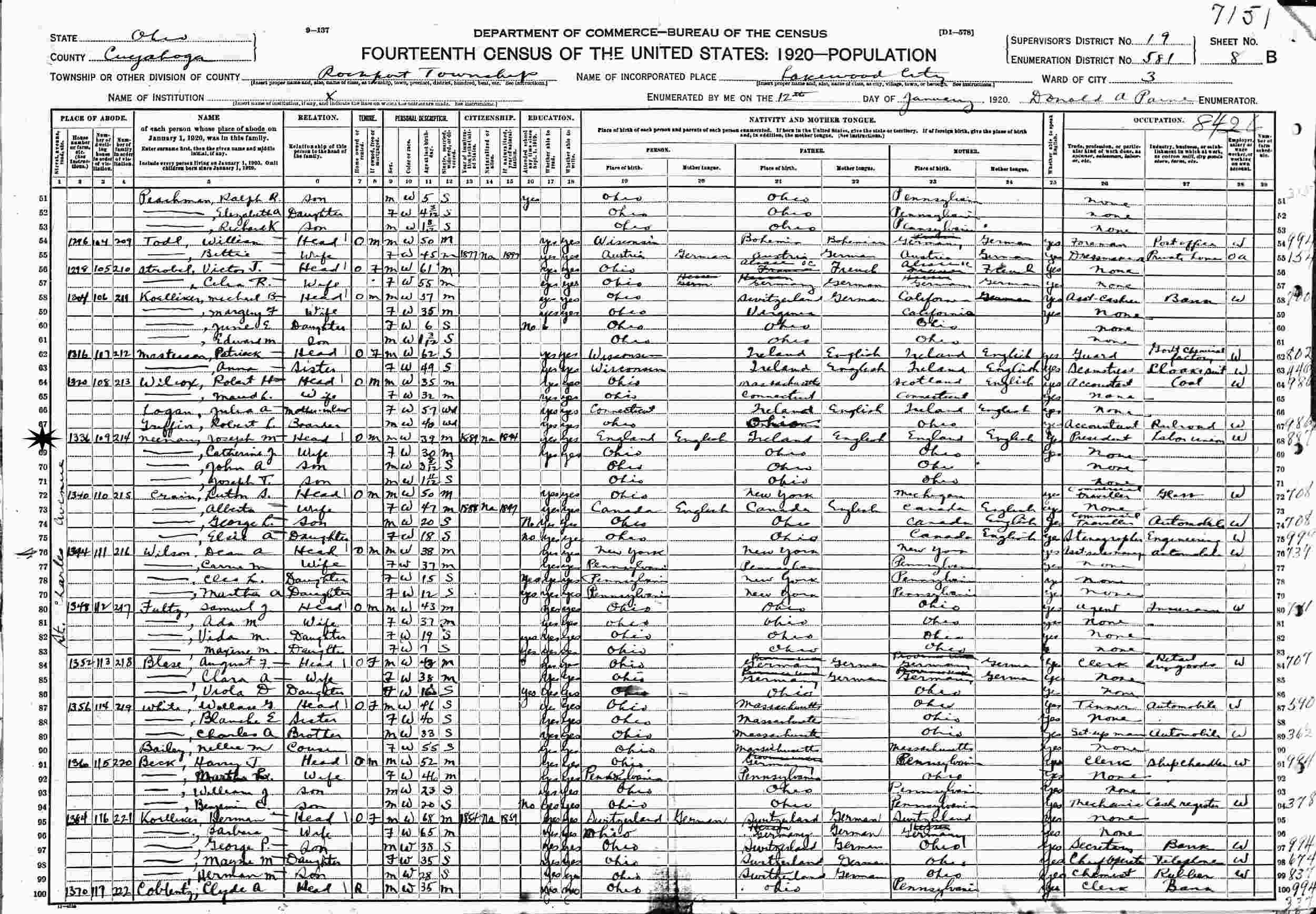 January 12, 1920 - 1336 St. Charles Avenue, Ward 3, Supervisor's District 19, Enumeration District 581, Rockport Township, Lakewood City, Cuyahoga County, Ohio.