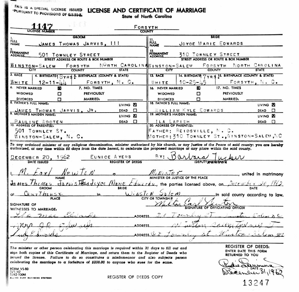 Married: James Thomas Jarvis, III December 20, 1963 in Winston-Salem, Forsyth County, North Carolina.