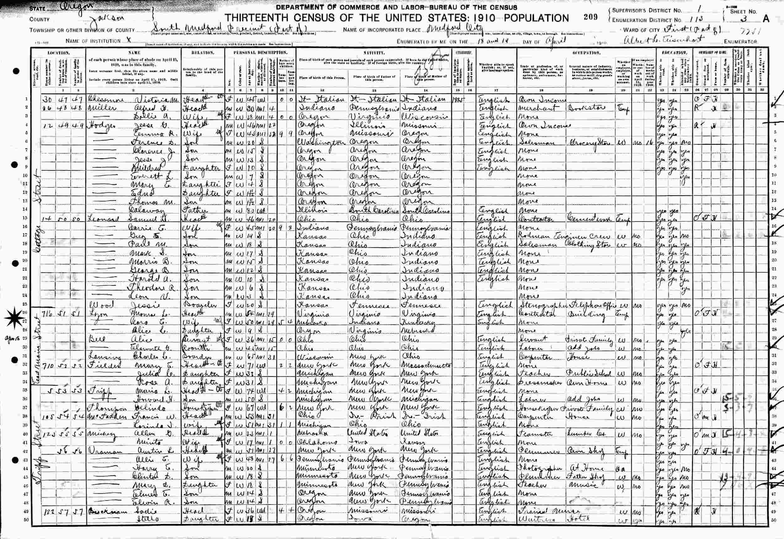April 18, 1910 - 716 East Main Street, Ward 1, Supervisor's District 1, Enumeration District 113, South Medford Precinct, Jackson County, Oregon.