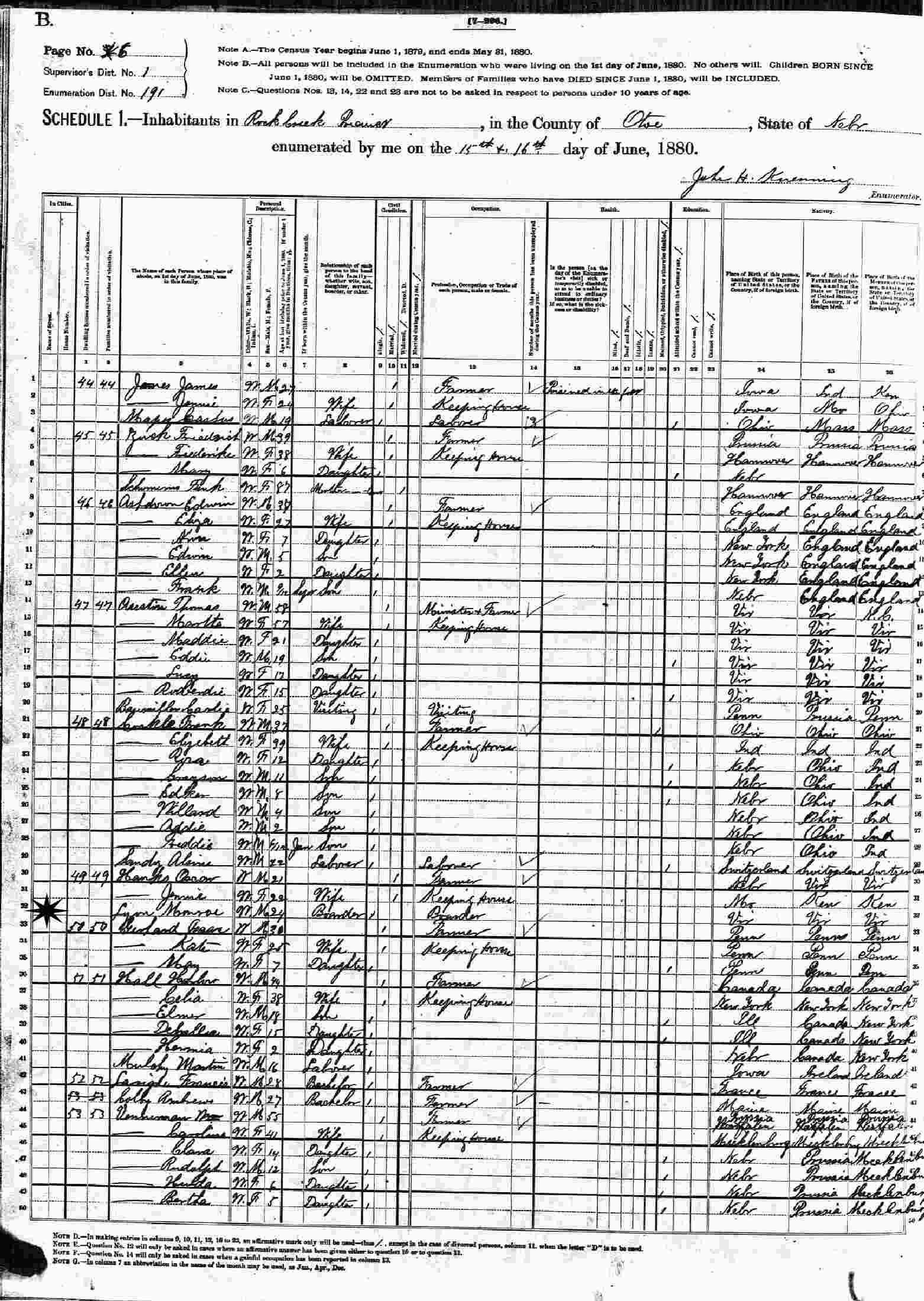 June 15-16, 1880 - Supervisor's District 1, Enumeration District 191, Rock Creek Precinct, Otoe, Nebraska (boarder).