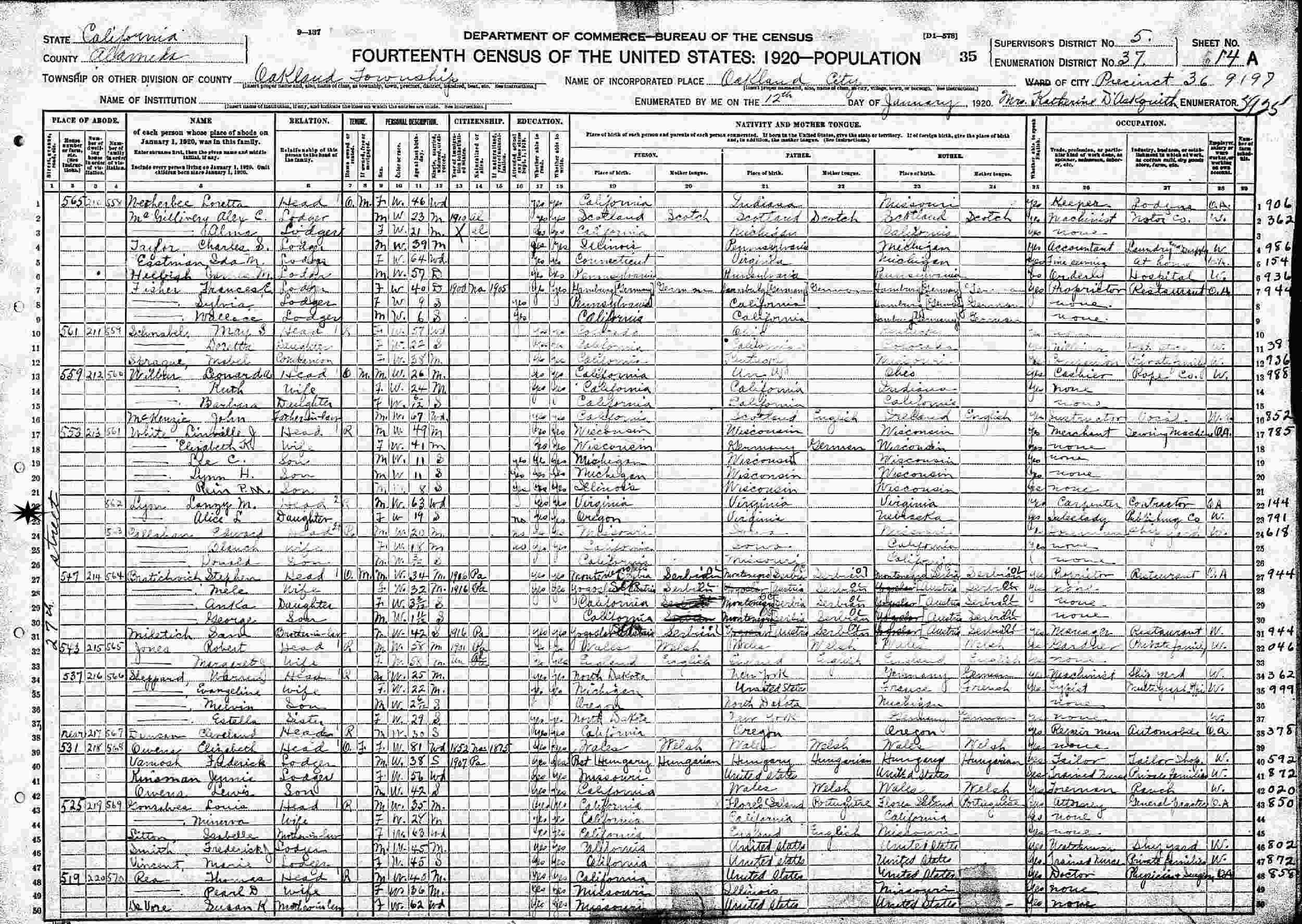January 12, 1920 - 553 27th Street, Precinct 36, Supervisor's District 5, Enumeration District 37, Oakland Township, Alameda County, California.