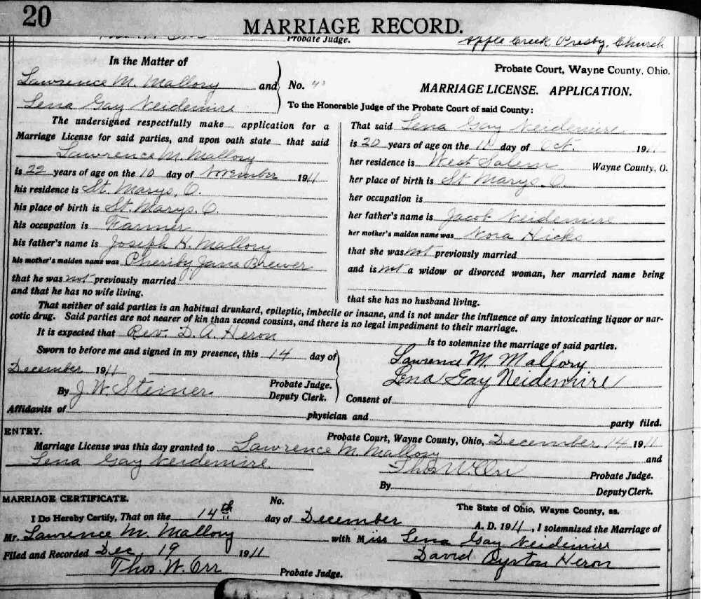 Married: Lena Gay Neidemire December 14, 1911 in Wayne County, Ohio.