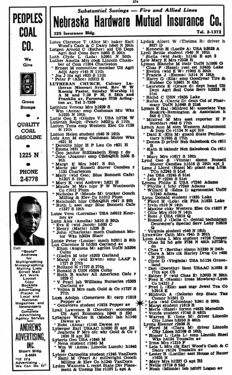 1942 - 341 S 20th, Lincoln, Lancaster County, Nebraska.