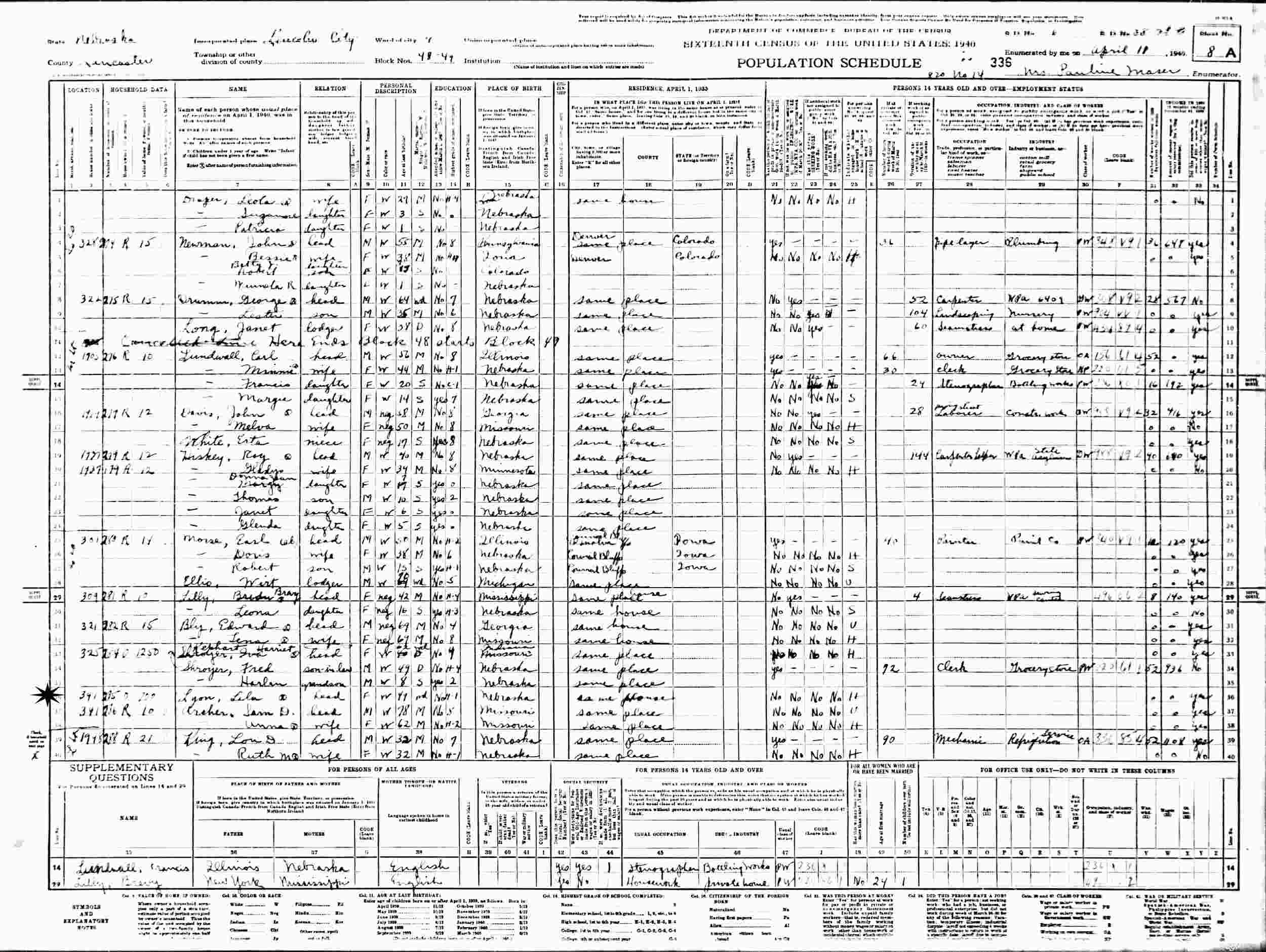 April 11, 1940 - 341 S 20th, Blocks 48-49, Supervisor's District 6, Enumeration District- 35-26, Lincoln, Lancaster County, Nebraska.