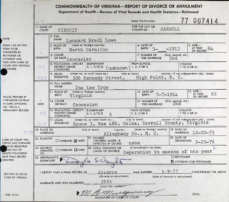 (2) Ina Lee Troy December 20, 1975 in Alleghany County, North Carolina. (Separation: February 25, 1976; Divorce: May 9, 1977, Carroll County, Virginia.)
