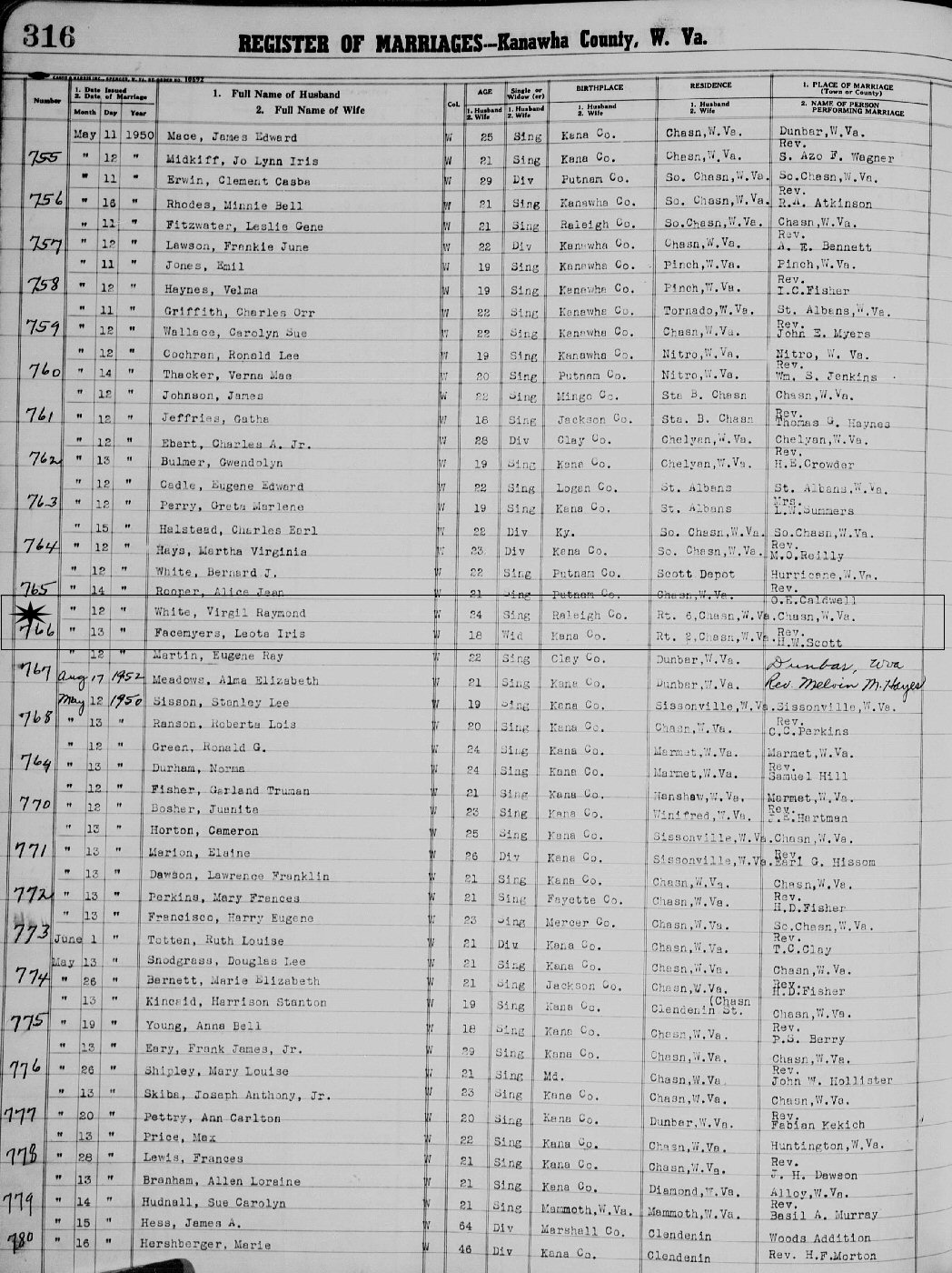 (2) Virgil Raymond White May 12, 1950 in Kanawha County, West Virginia.