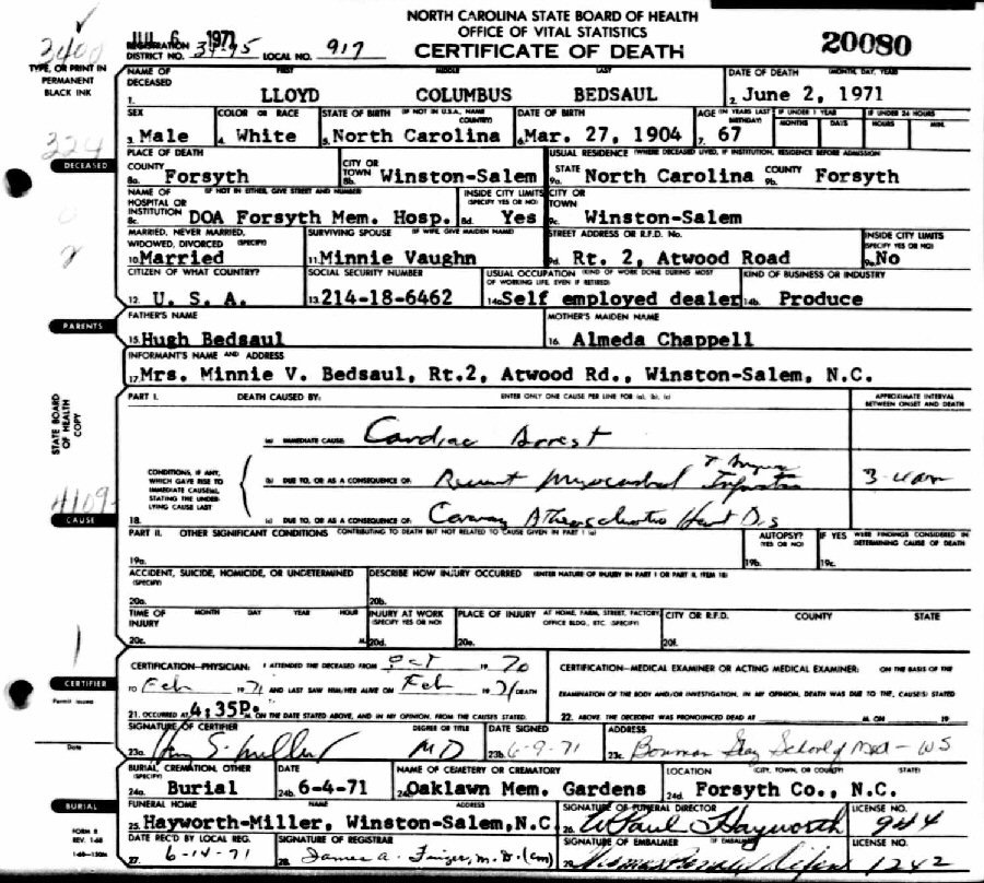 Died: June 2, 1971 in Forsyth Memorial Hospital, Winston-Salem, Forsyth County, North Carolina.