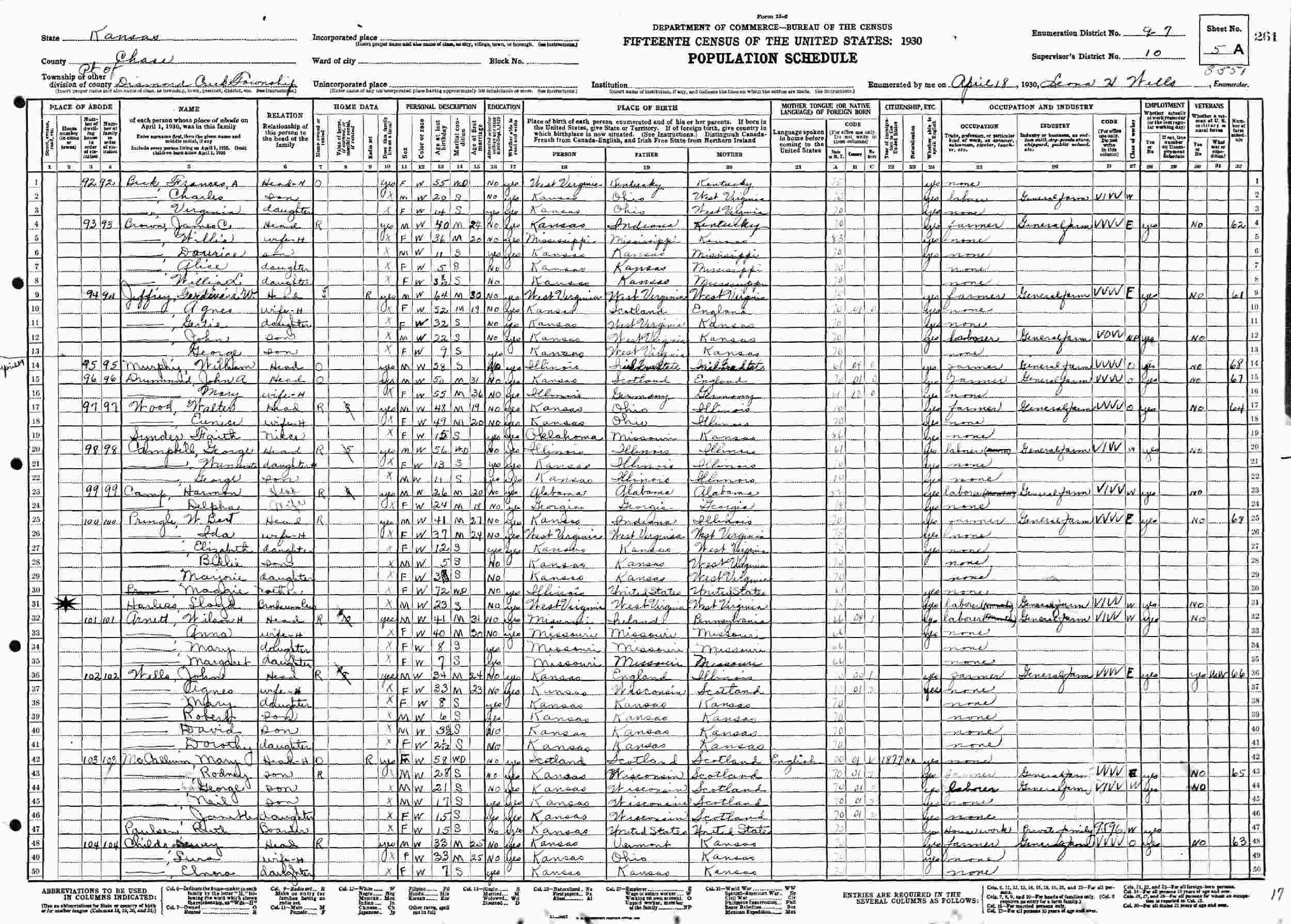 April 18, 1930 - Supervisor's District 10, Enumeration District 97, Diamond Creek Township, Chase County, Kansas, (w/brother-in-law and sister, W Bert and Ida Pringle).