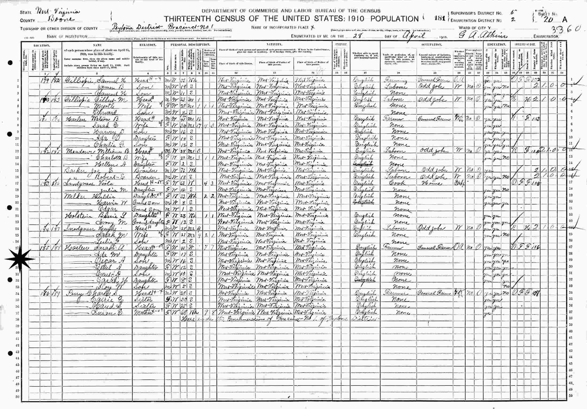April 28, 1910 - Precinct 1, Supervisor's District 6, Enumeration District 2, Petona District, Boone County, West Virginia.