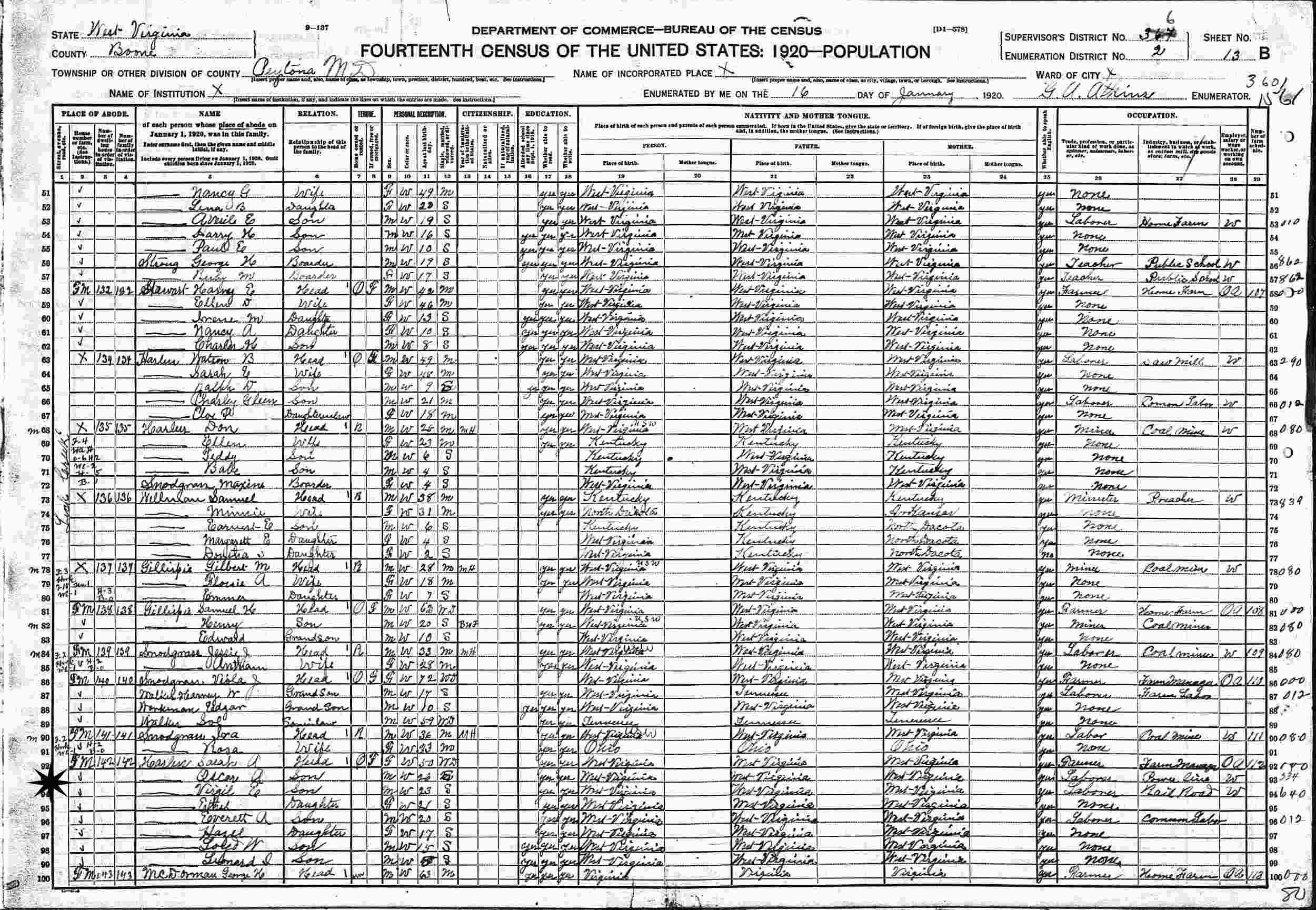 Janury 16, 1920 - Supervisor's District 6, Enumeration District 2, Petona District, Boone County, West Virginia.