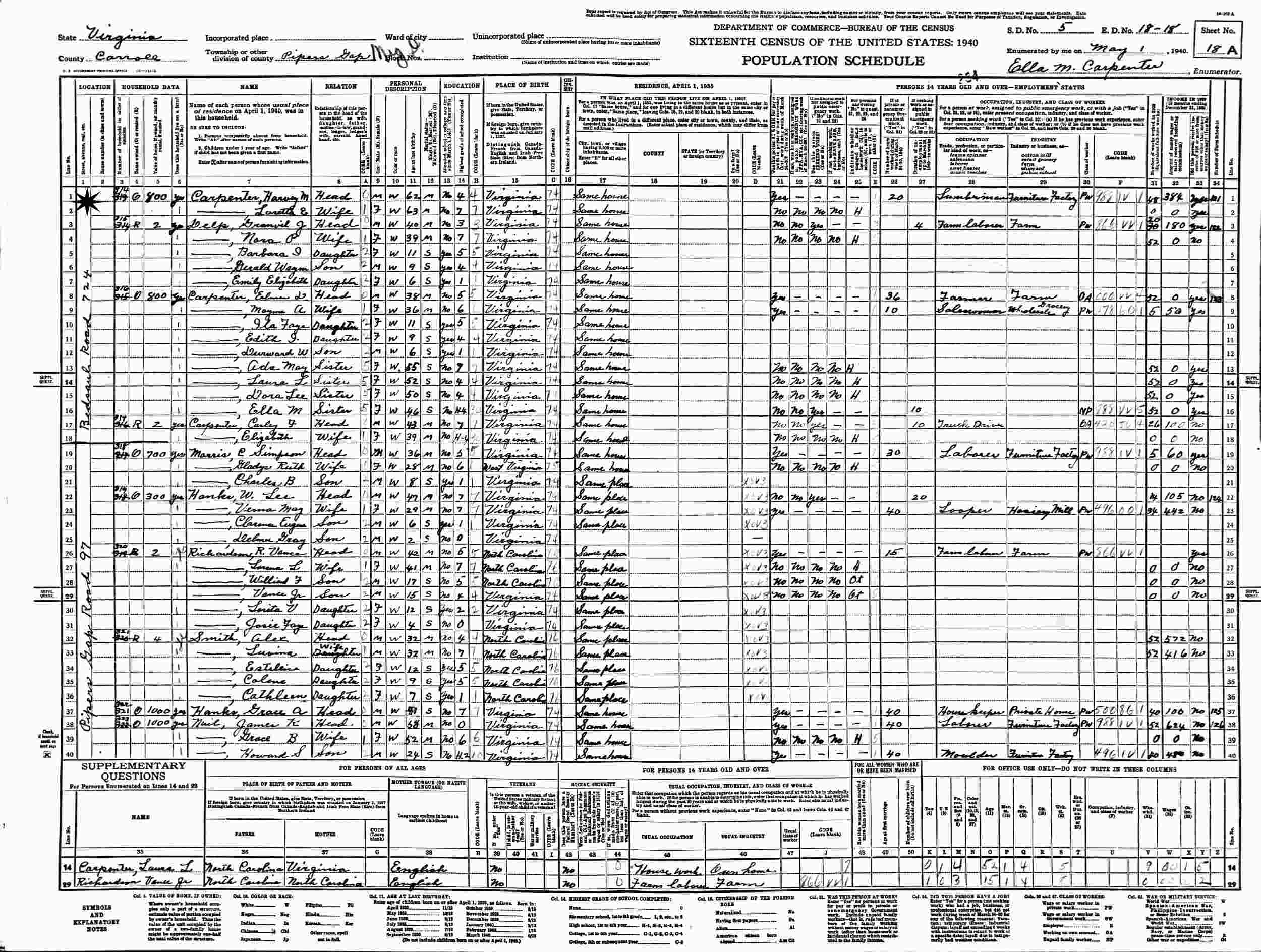 May 1, 1940 - Bedsaul Road 724, Supervisor's District 5, Enumeration District 18-18, Pipers Gap, Carroll County, Virginia.